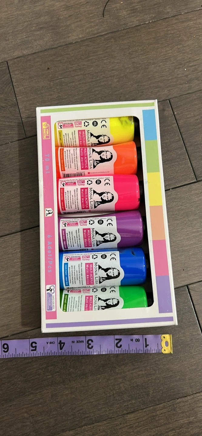 Get creative with this set of Mona Lisa Multi Acrylic paints! This set includes 6 vibrant colours, perfect for all your art projects. Each bottle contains 70ml of paint. The paints are also safe for kids. Box included!