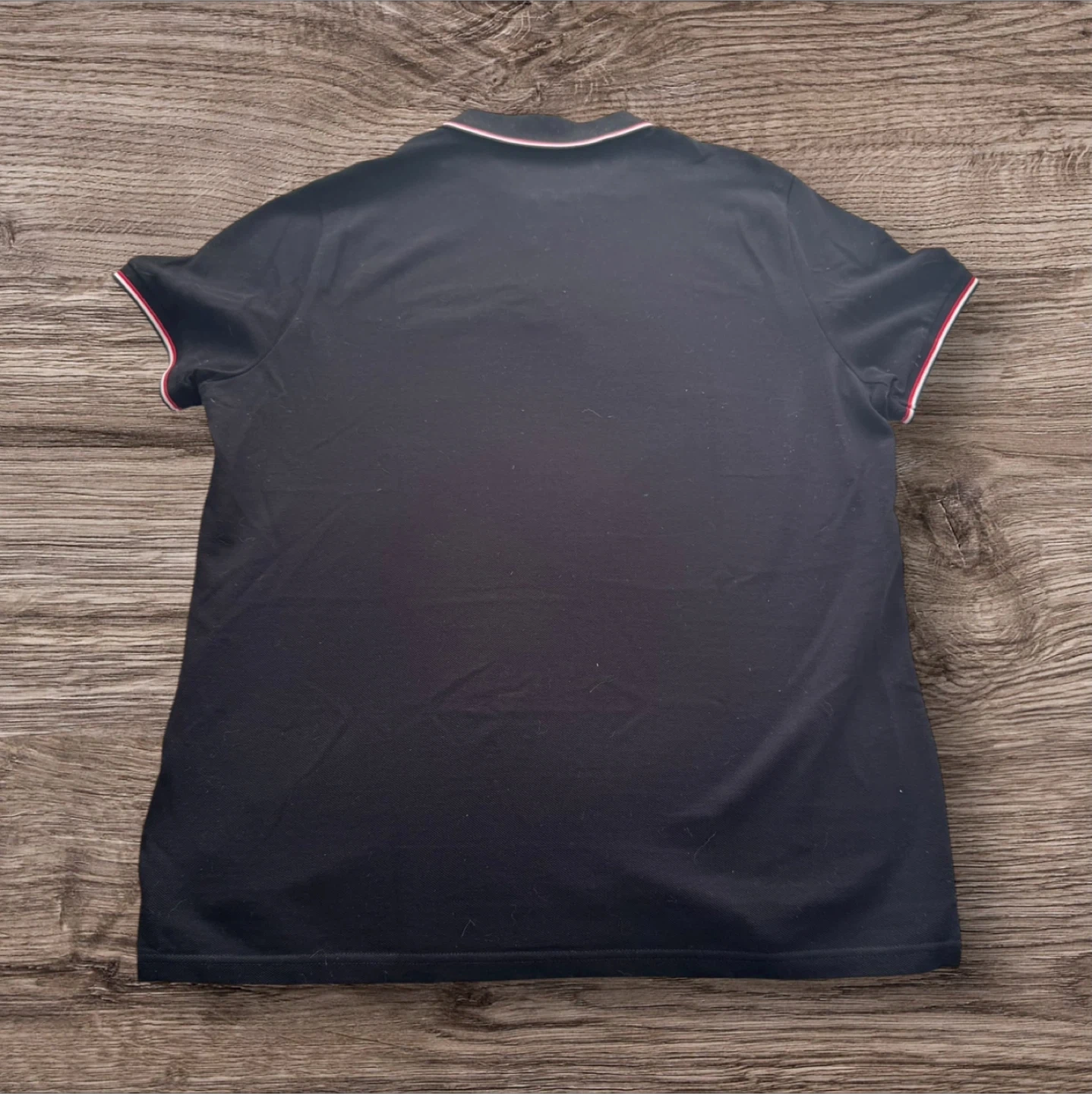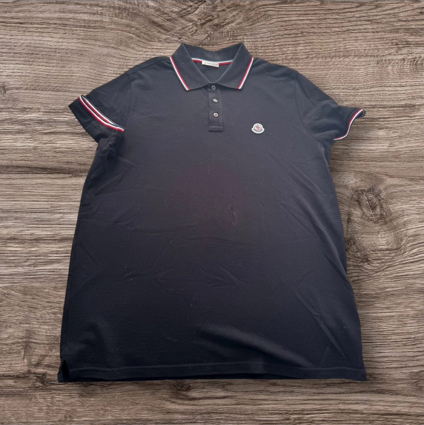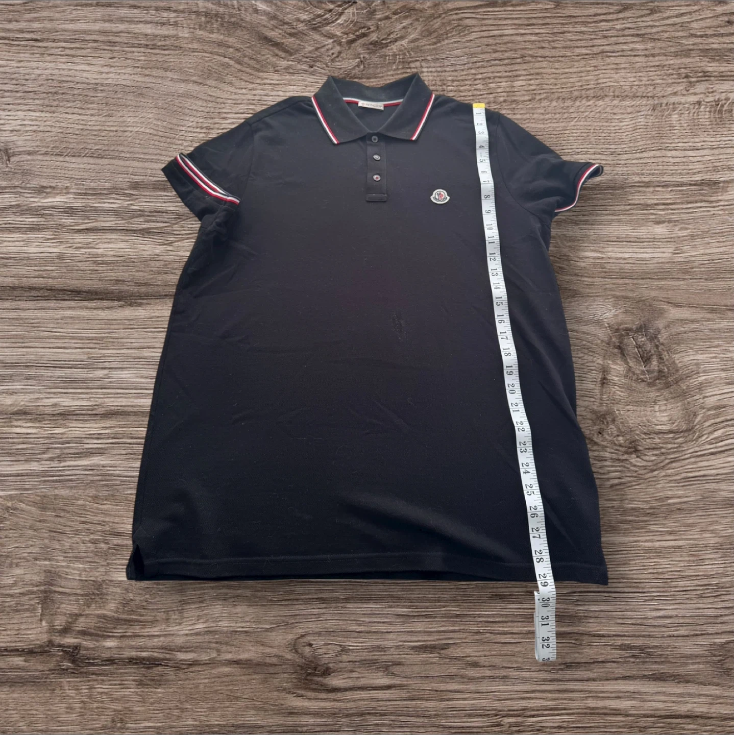 Selling a gently used Moncler polo shirt in black. It features a classic design with red and white trim on the collar and sleeves. Size is XL. Perfect for a casual yet stylish look!
