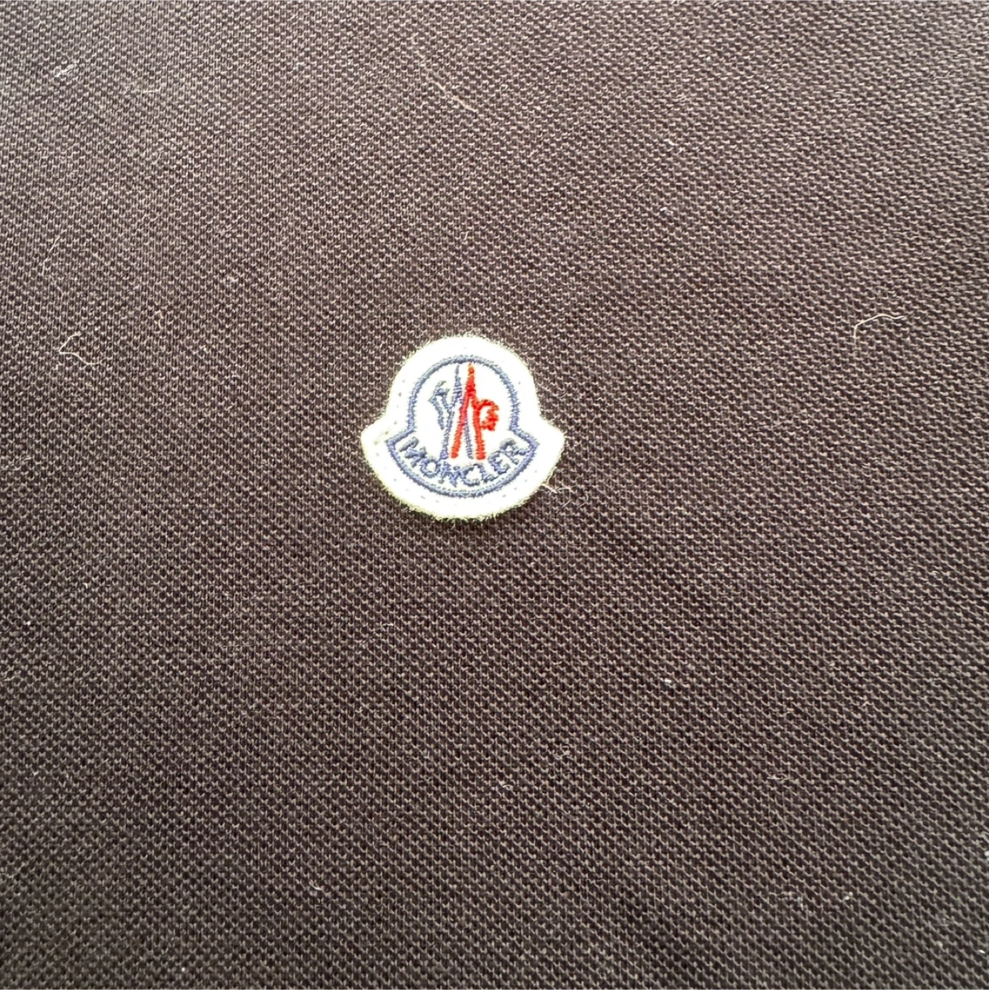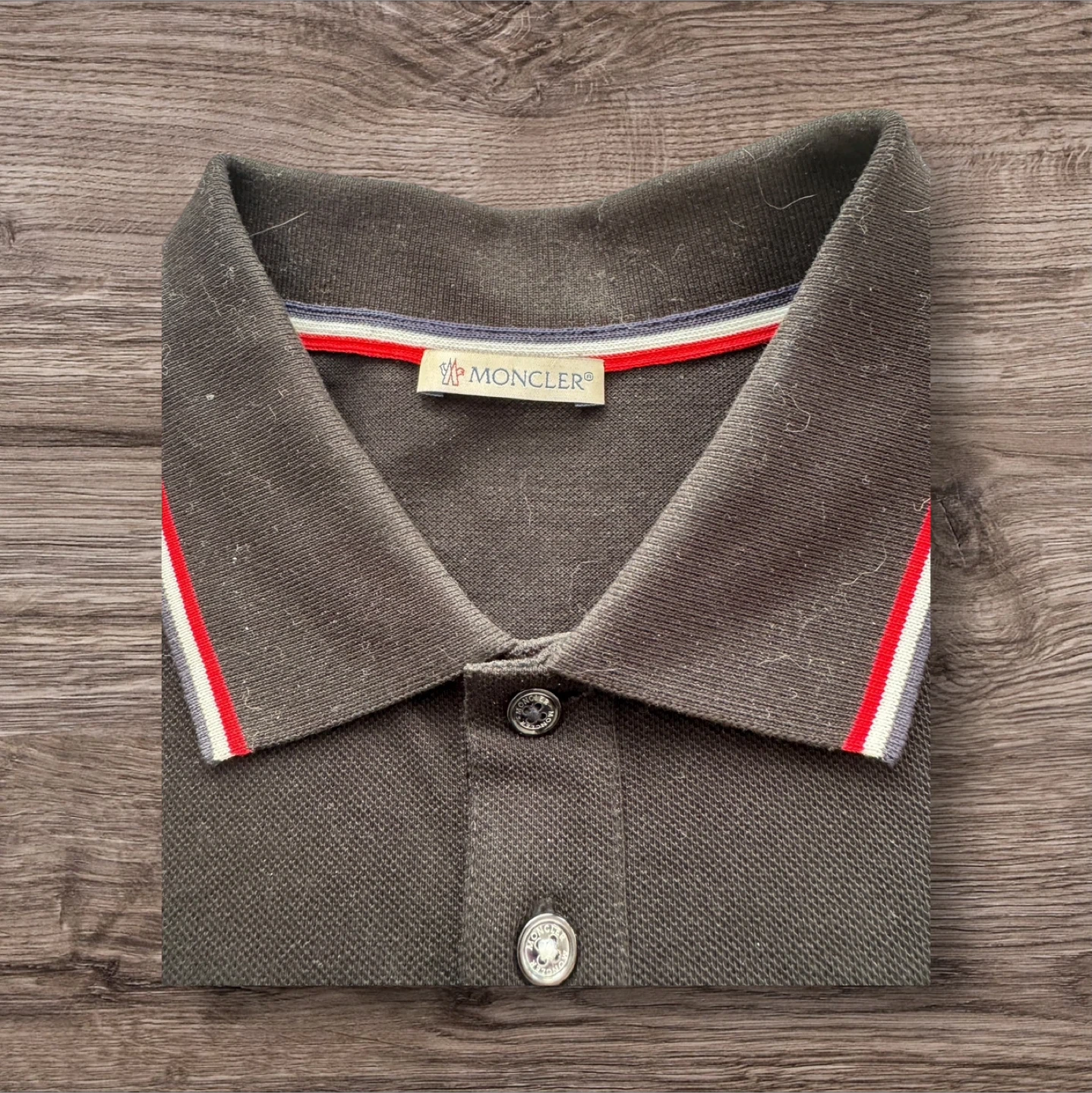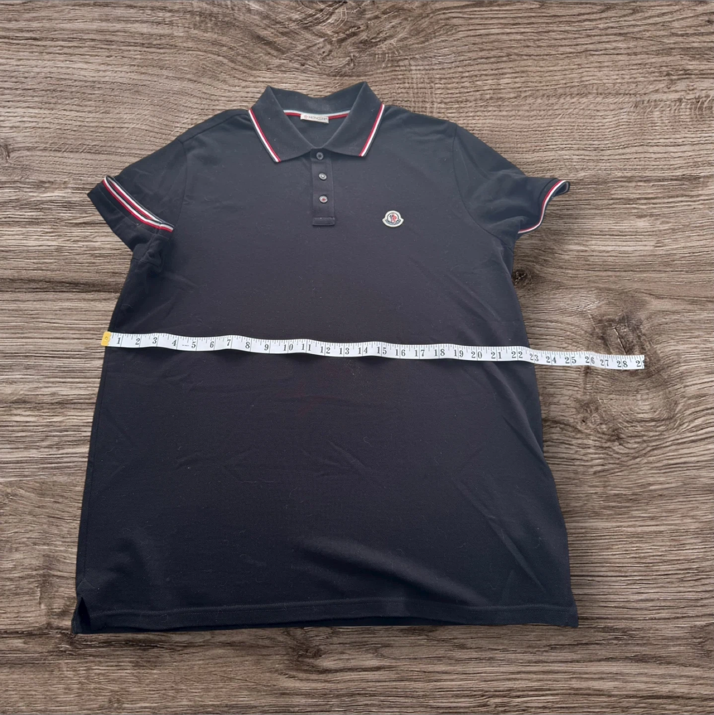 Selling a gently used Moncler polo shirt in black. It features a classic design with red and white trim on the collar and sleeves. Size is XL. Perfect for a casual yet stylish look!
