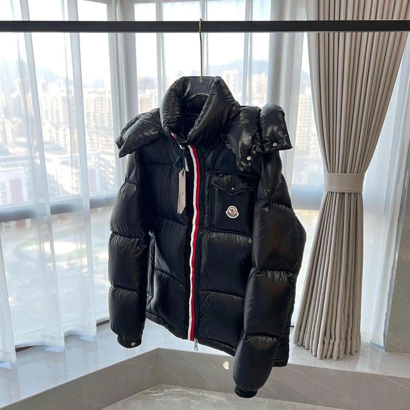 Classic Moncler Maya. Black, shiny nylon. Features a hood and tricolor stripe detail. Zipper closure. Excellent condition.