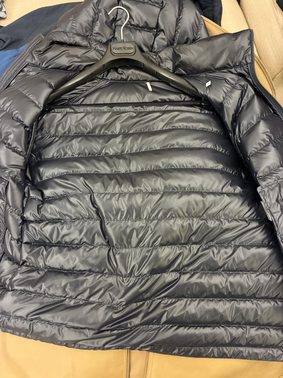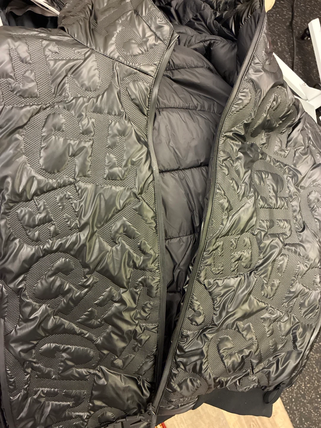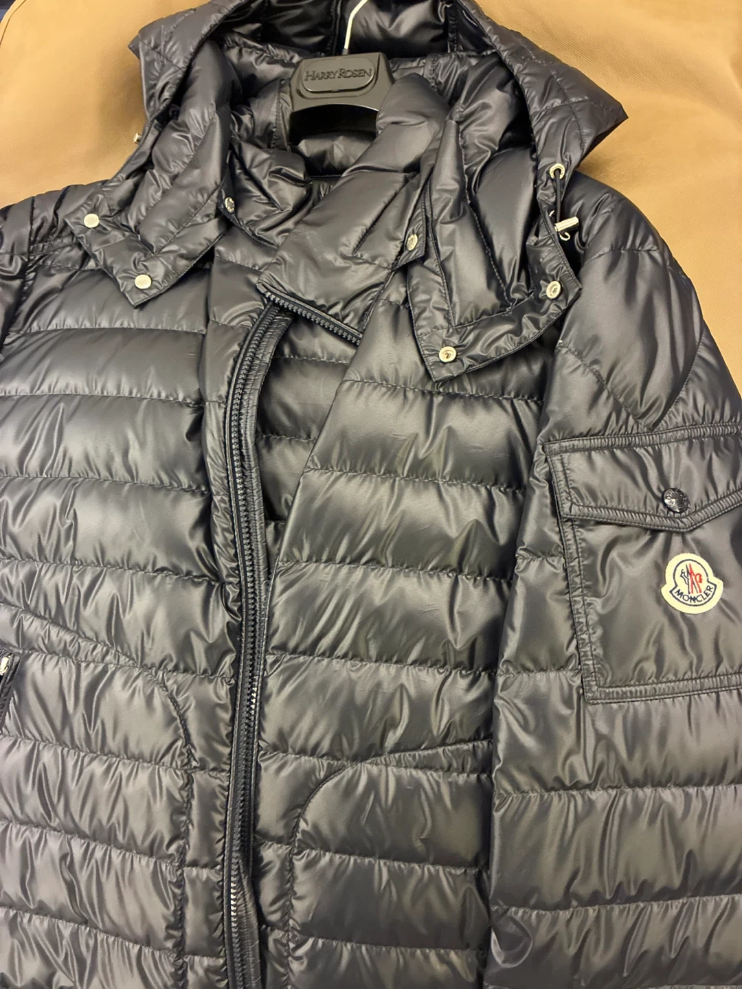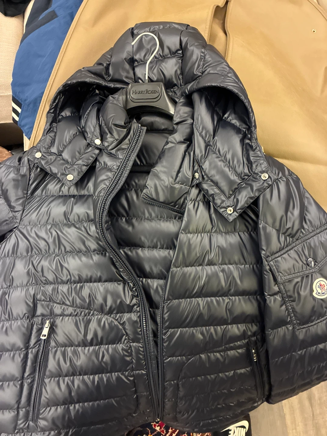 Selling a black Moncler padded jacket. It's in great condition and perfect for the cooler weather. The jacket features a quilted design and a Moncler logo patch on the sleeve. It's a stylish and functional piece to add to your wardrobe