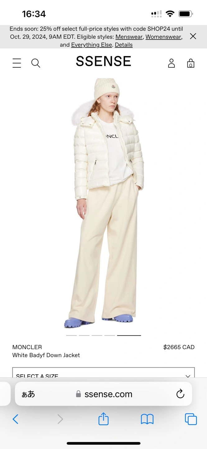 White down jacket with fur-lined hood. Zipper closure. Two front pockets.