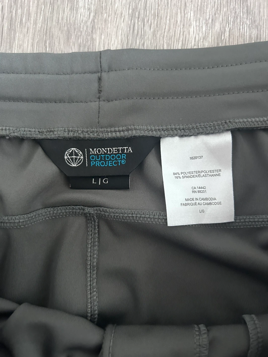 Selling a pair of Mondetta Outdoor Project pants in size large. These pants are made of 84% polyester and 16% spandex/elastane. They feature a comfortable design with a drawstring waist and a zippered pocket on the side. Great for outdoor activities or casual wear!