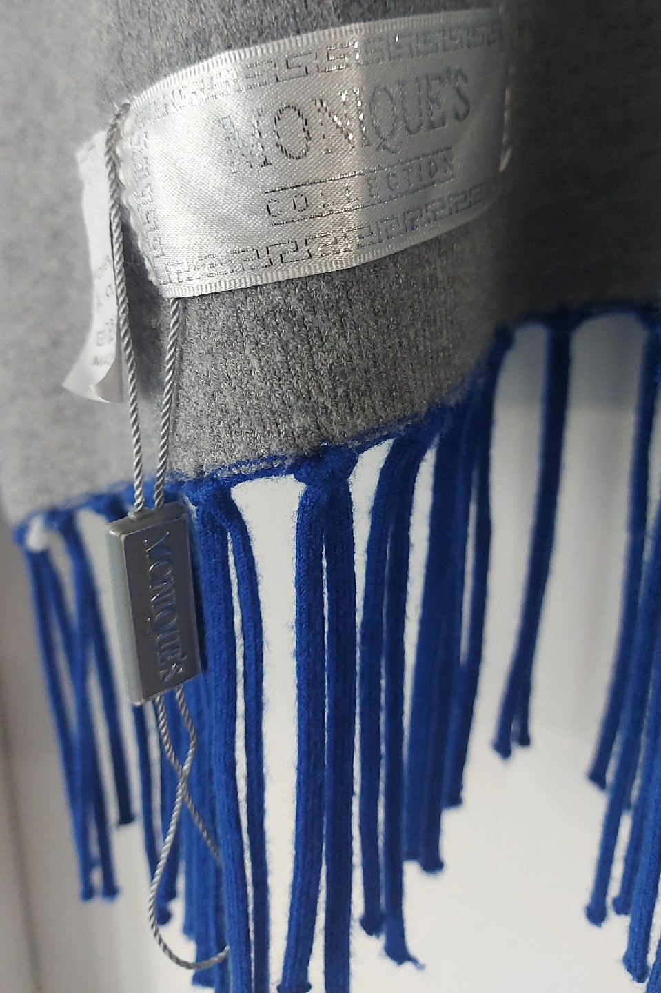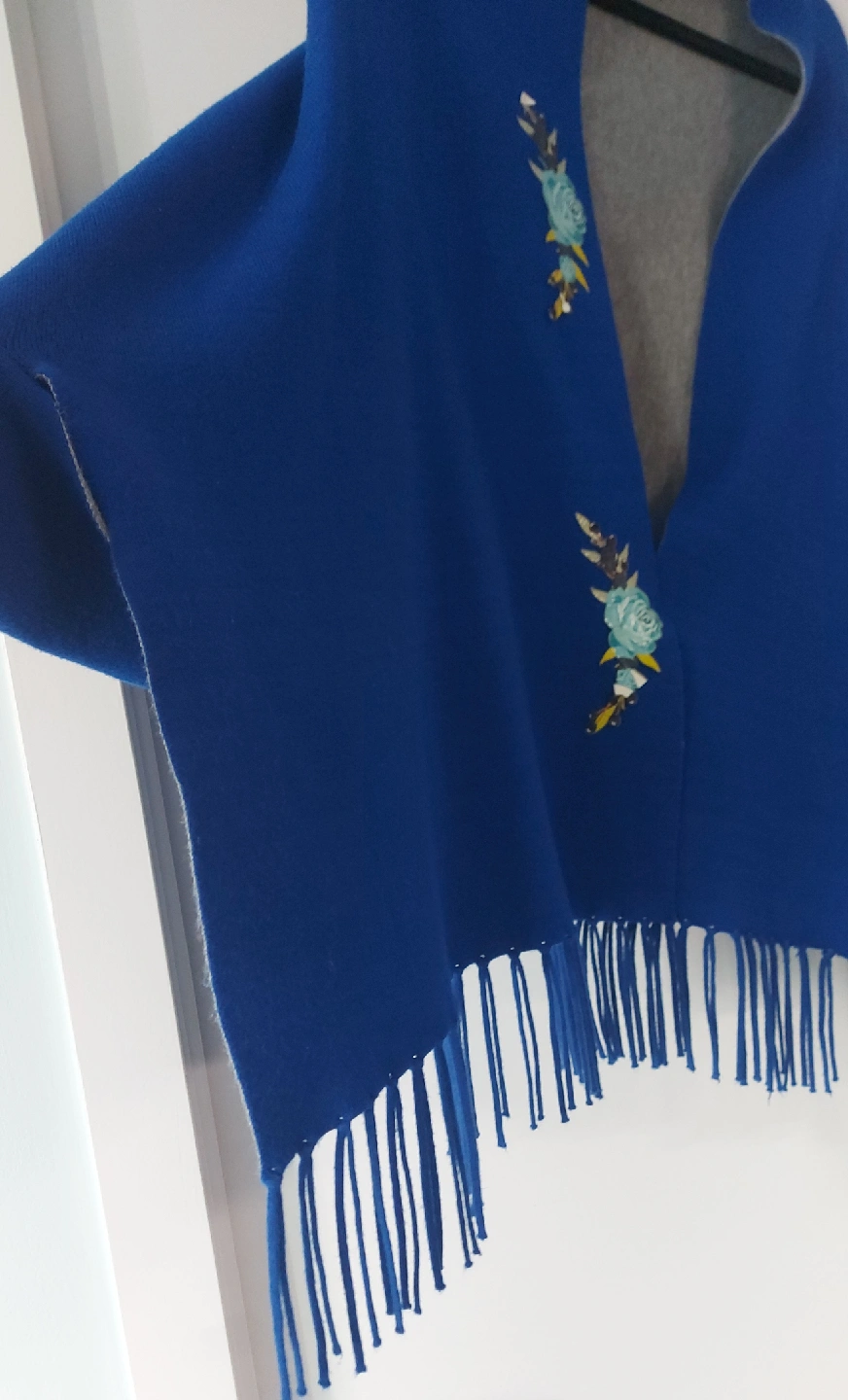 Cozy up with this beautiful shawl from Monique's Collection! It features a lovely blue colour with fringe detailing and floral embroidery. Perfect for adding a touch of elegance to any outfit