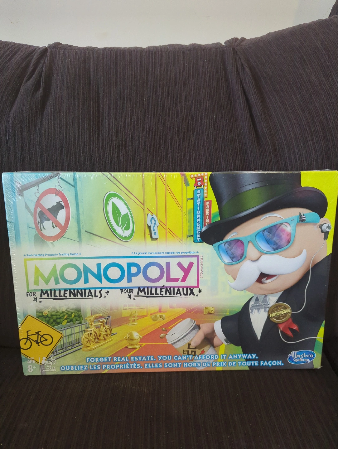 Selling a Monopoly for Millennials board game! It's a fast-dealing property trading game. The box says, "Forget real estate. You can't afford it anyway."