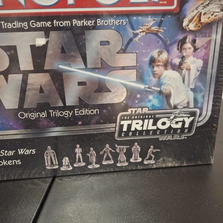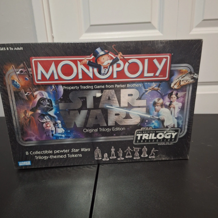 Selling a Monopoly Star Wars Original Trilogy Edition board game! It's a property trading game from Parker Brothers. The game includes: - Gameboard - Property Cards - Play Money and Banker's Tray - 2 Dice - 8 Pewter Tokens - Rebel Cards - Imperial Cards - 32 X-wing Fighters - 12 Corellian Freighters - 32 TIE Fighters - 12 Star Destroyers