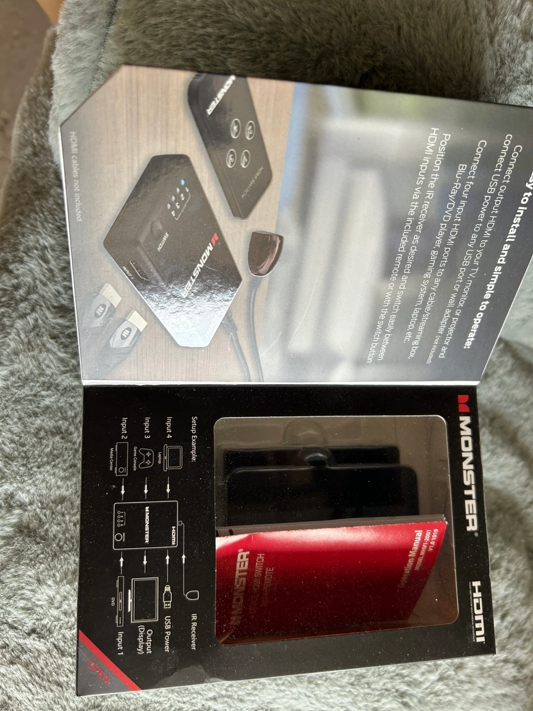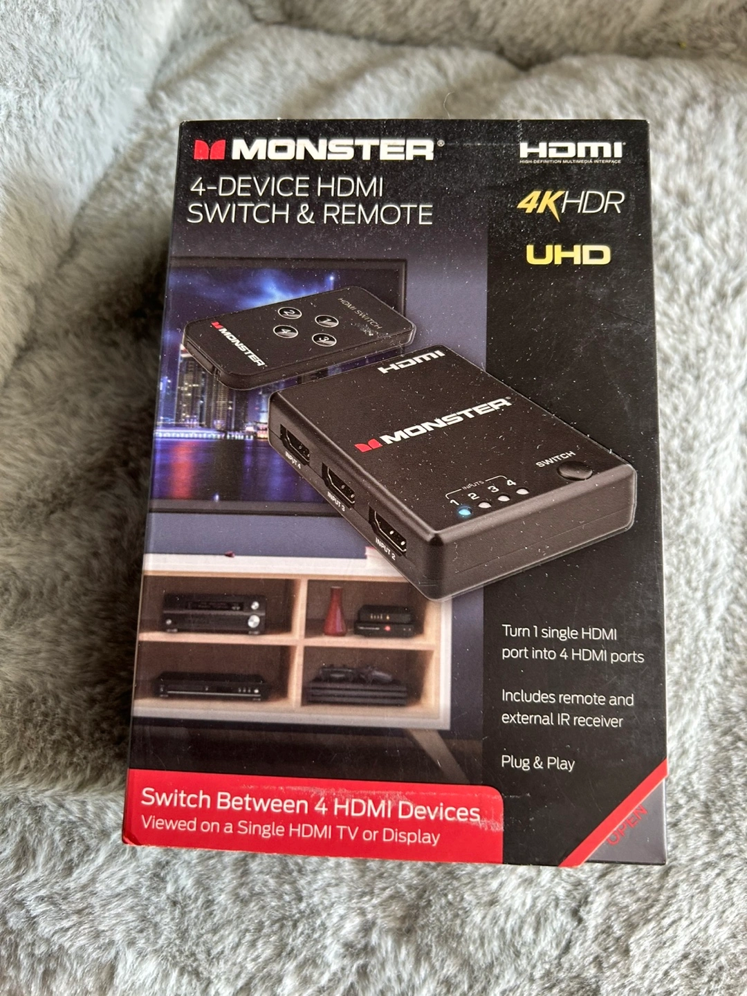 Selling a brand new Monster 4-Device HDMI Switch & Remote! It's still in its original box and has never been used. Turn one single HDMI port into four HDMI ports. It includes a remote and external IR receiver, and it's plug & play ready. Now you can easily switch between 4 HDMI devices on a single HDMI TV or display. HDMI cables are not included
