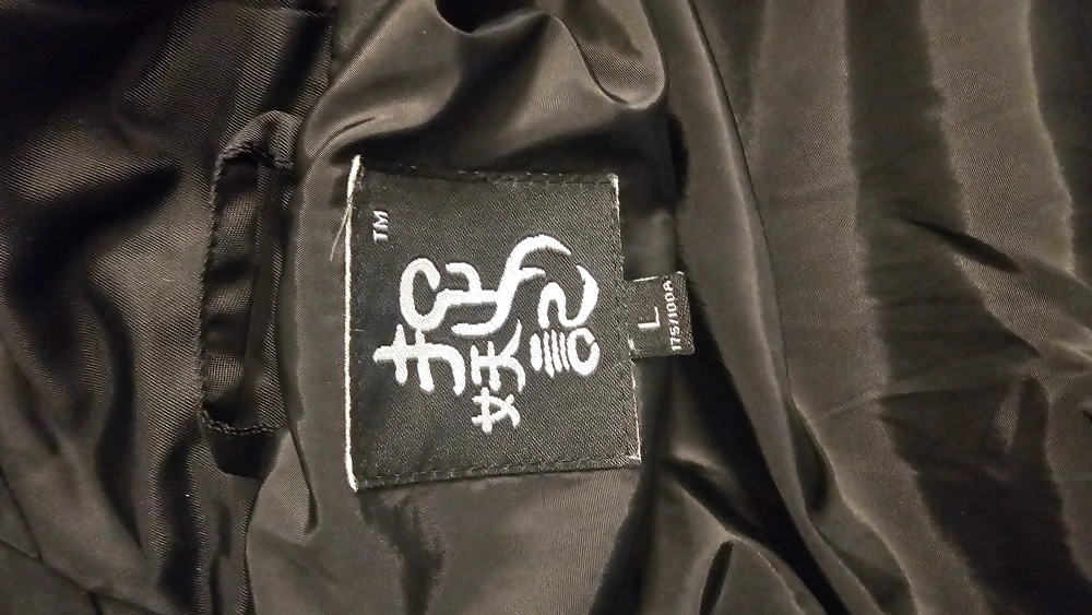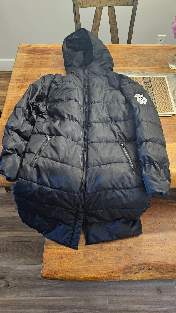 Black puffer jacket. Features a large embroidered Monster Hunt 2 logo on the back. Long length, hooded. Size large. Film Crew.