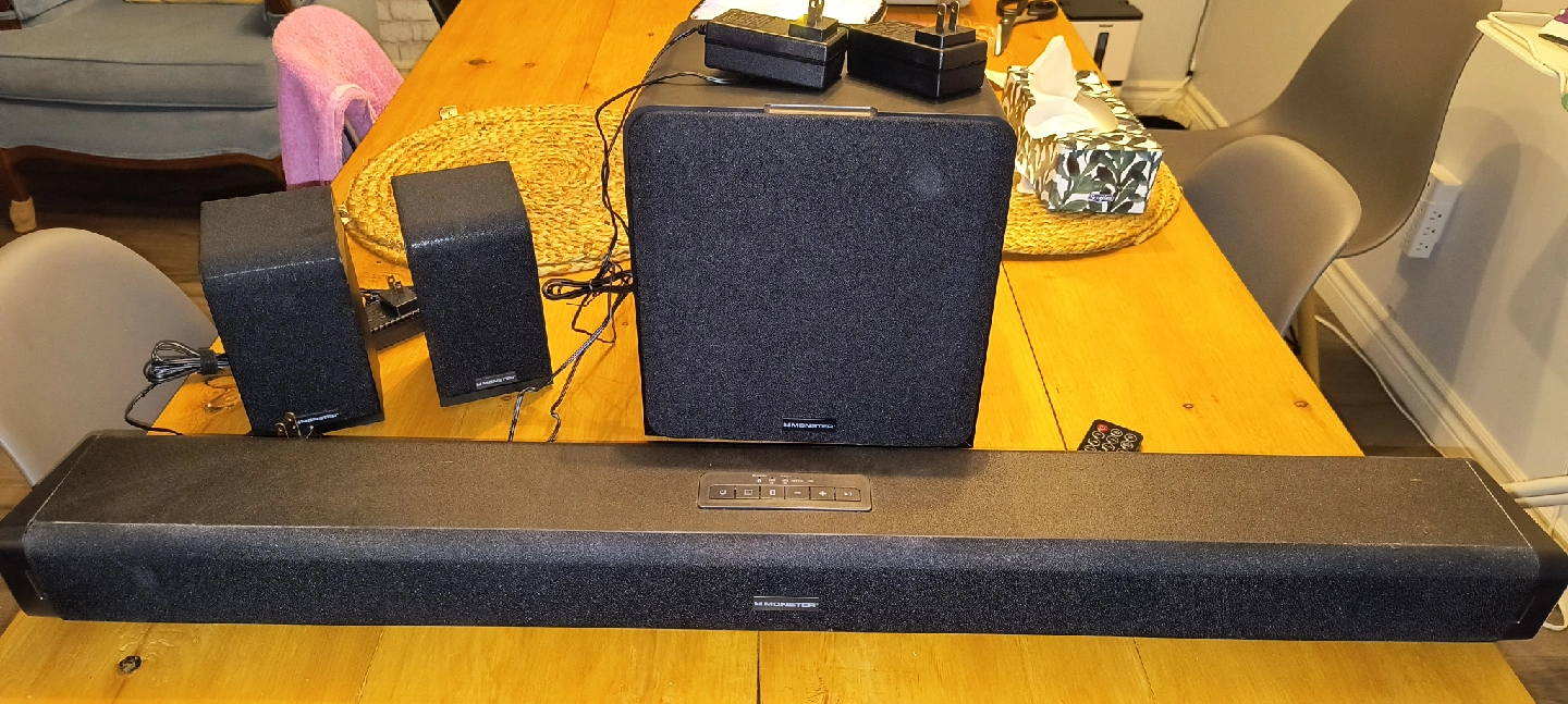 Selling a Monster MSB3788W 37" Bluetooth 5.1 Sound Bar with Wireless Subwoofer and 2 Satellite Speakers. Full surround. Included: - Soundbar - Wireless Subwoofer - 2 Satellite Speakers - Audio cables and screws for wall mounting - Remote