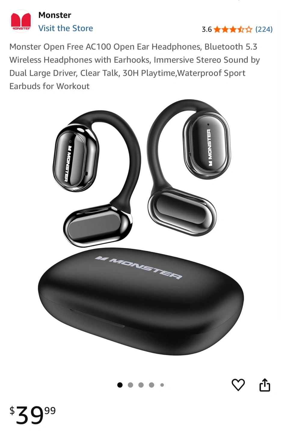 Selling a brand new pair of Monster Open Free AC100 open ear headphones! They feature Bluetooth 5.3 wireless connectivity and come with a charging case. The dual large driver provides immersive stereo sound and clear talk. Perfect for workouts with 30H playtime and waterproof sport earbuds. Comes with the original box!