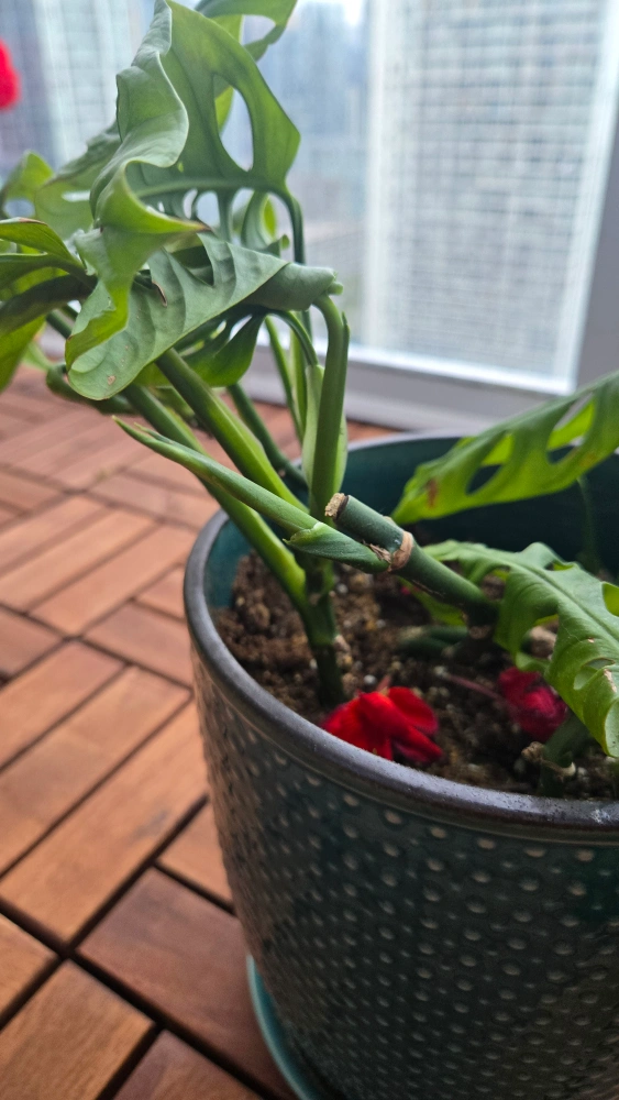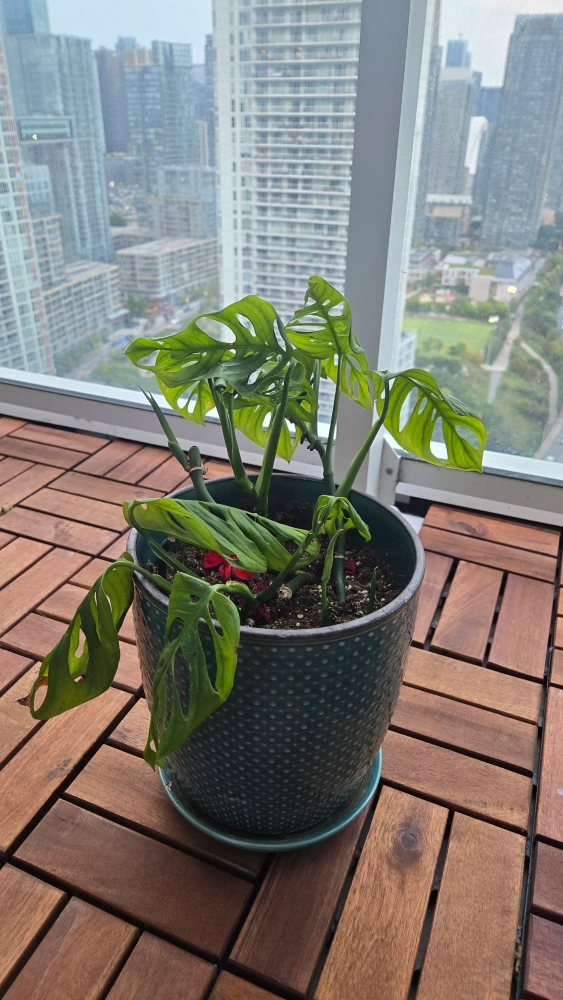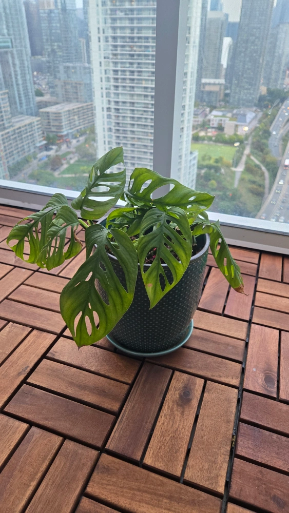 Selling a Monstera Adansonii plant in a pretty green pot. It's a lovely plant that's easy to care for and adds a nice touch of greenery to any space