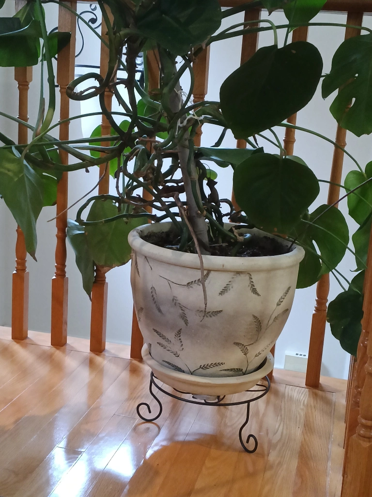 Selling a healthy monstera plant, perfect for adding a touch of green to your home! It comes in a beautifully decorated pot with a matching saucer and stand. It's been well cared for and is ready to thrive in a new home