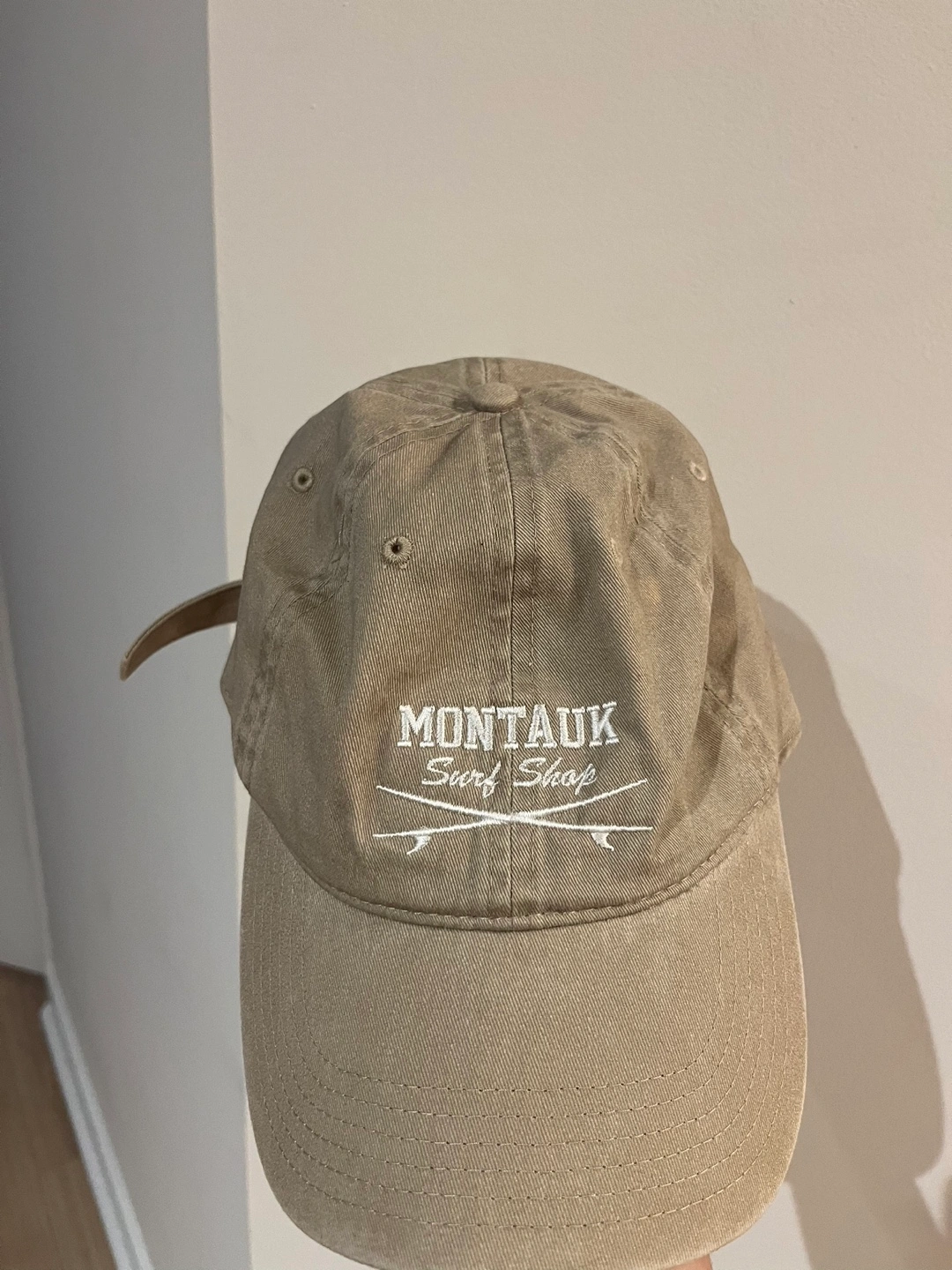 Lightly used beige dad hat. Features embroidered Montauk Surf Shop logo. Adjustable strap.