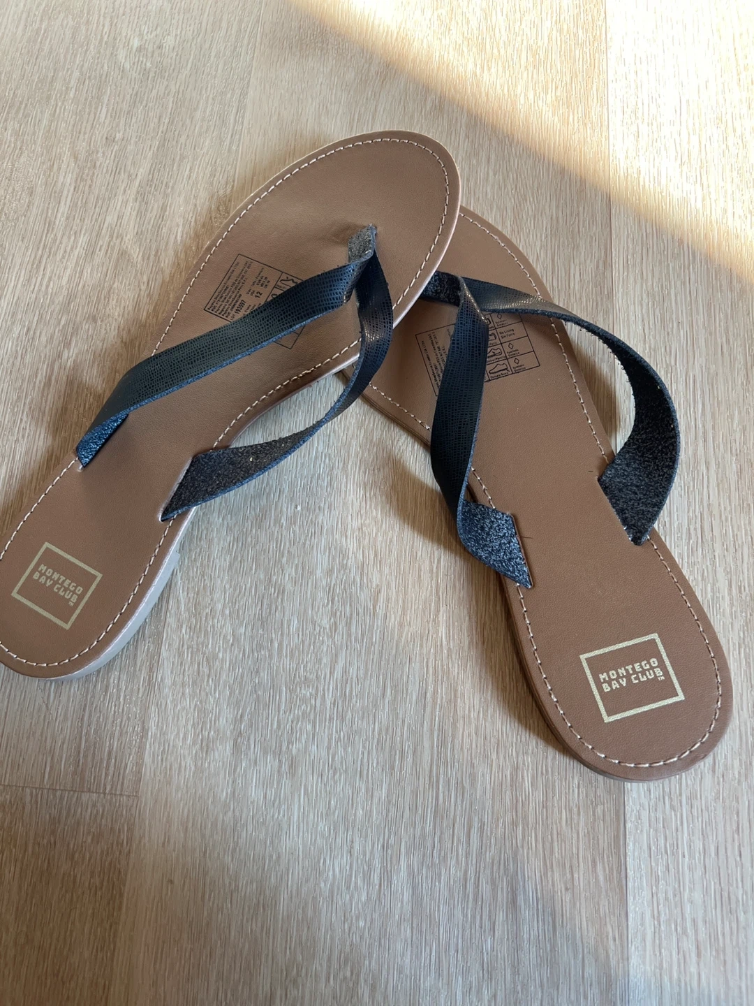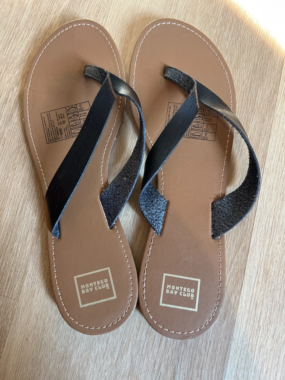 Selling a pair of Montego Bay Club flip flops in size 12. They feature a sleek black strap and a comfortable sole, perfect for summer days or a trip to the beach. They are in great condition and they have never been worn and ready for a new home!