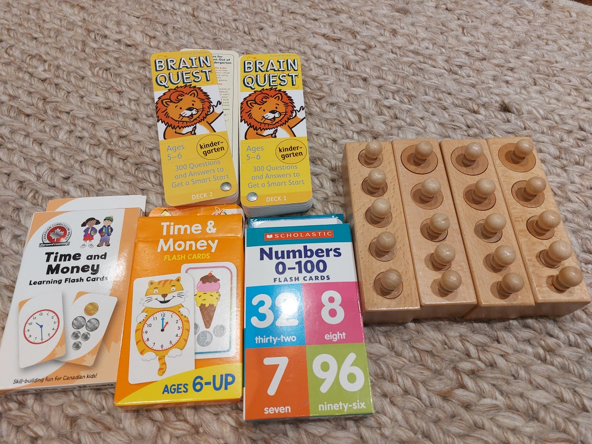 Multiple packages of flash cards and wooden Montessori toy in excellent condition.