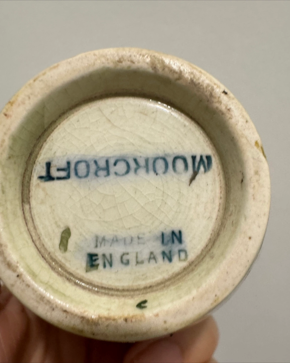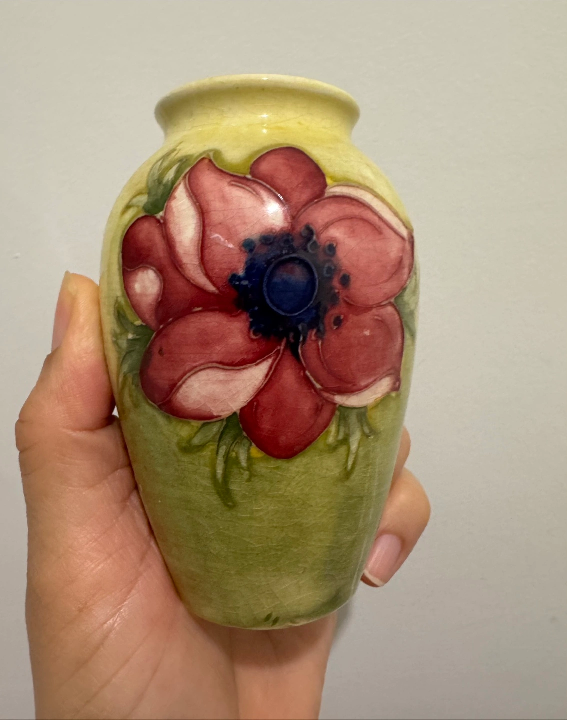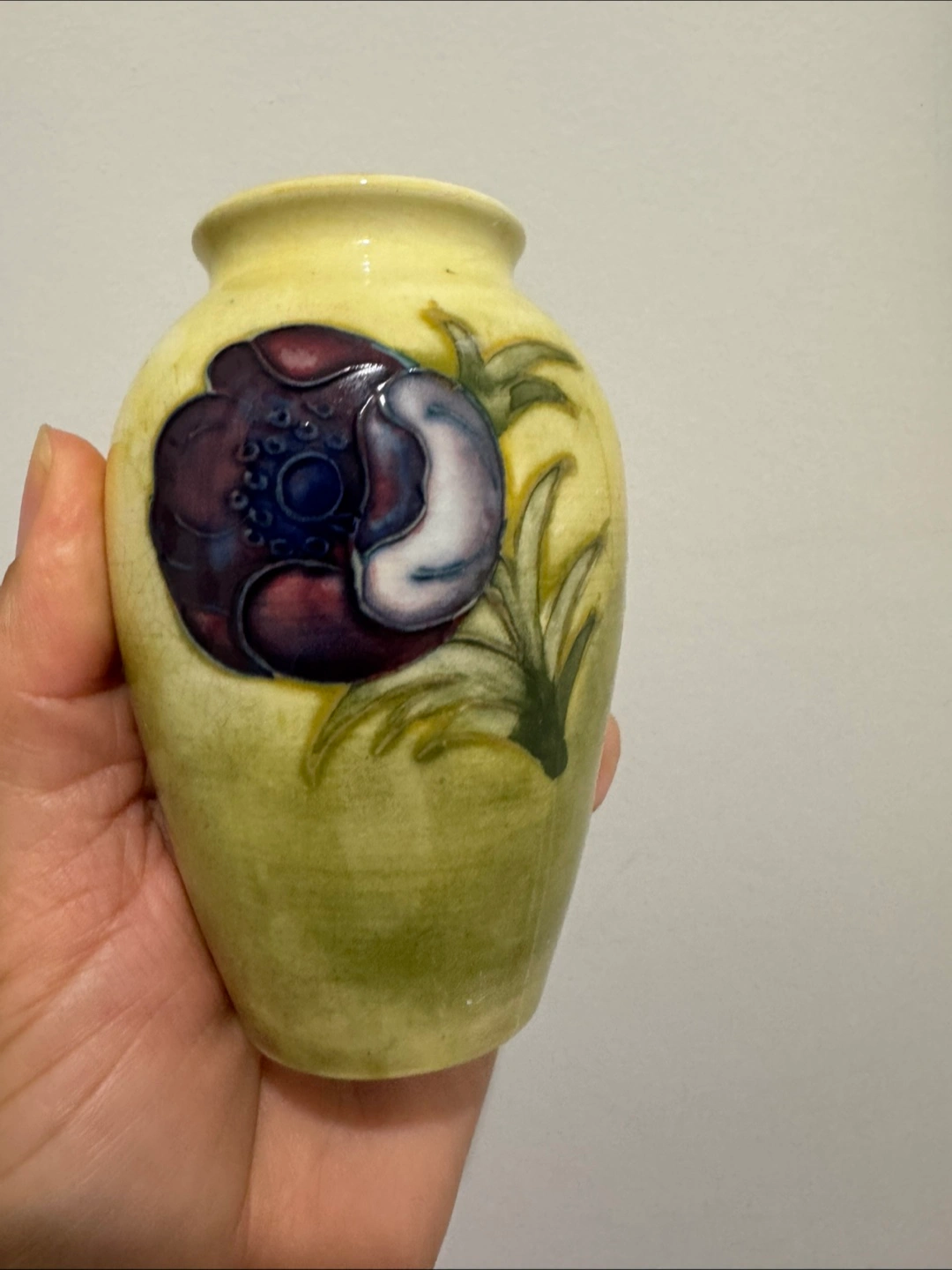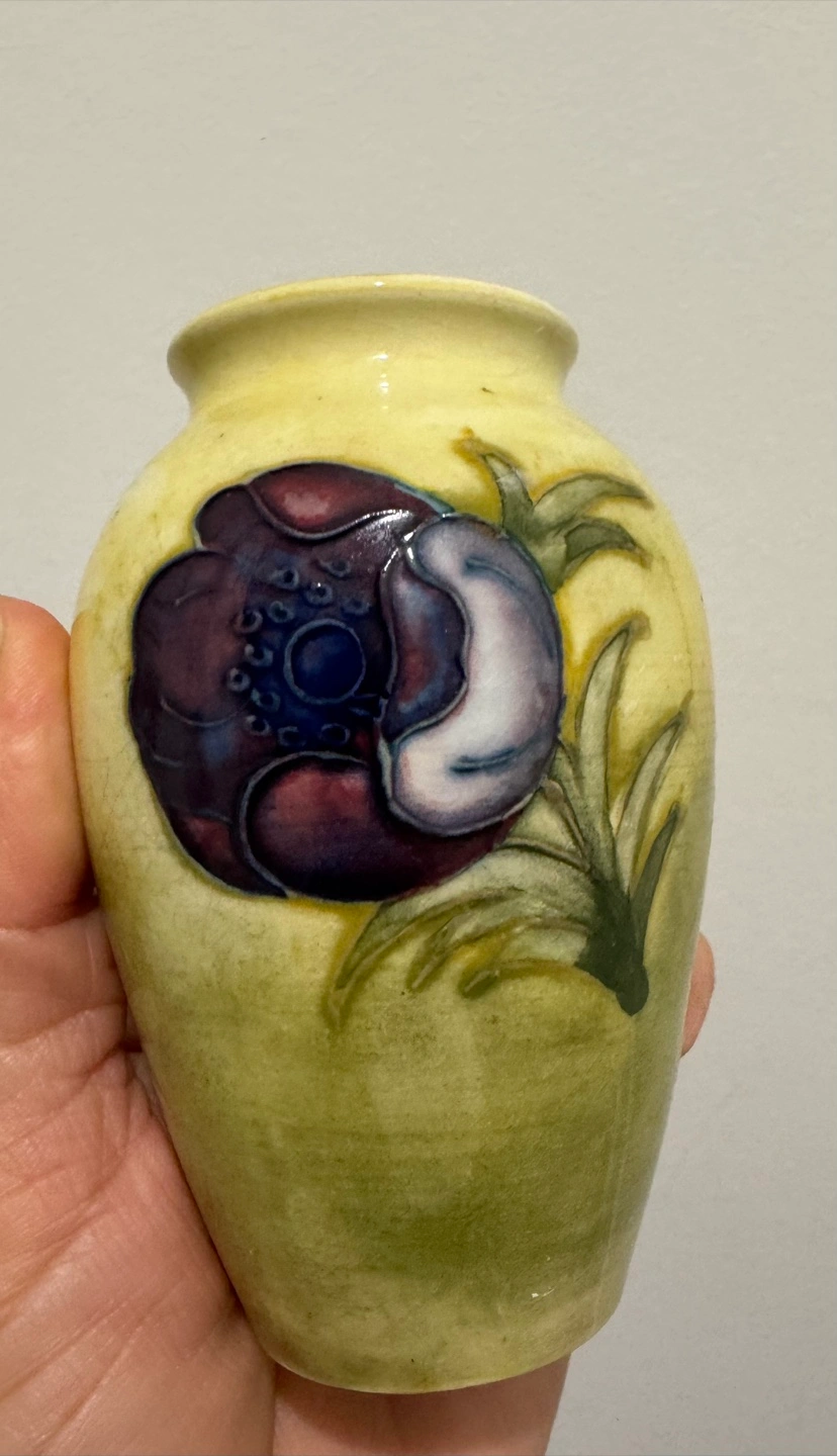 Small Moorcroft vase. Features a single anemone. Pale yellow-green glaze. Made in England. Cash Pick up near Lawrence and Keele