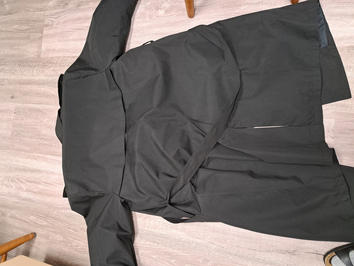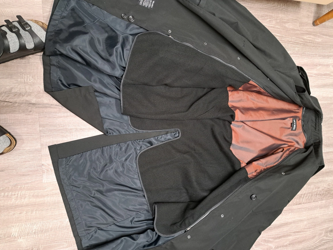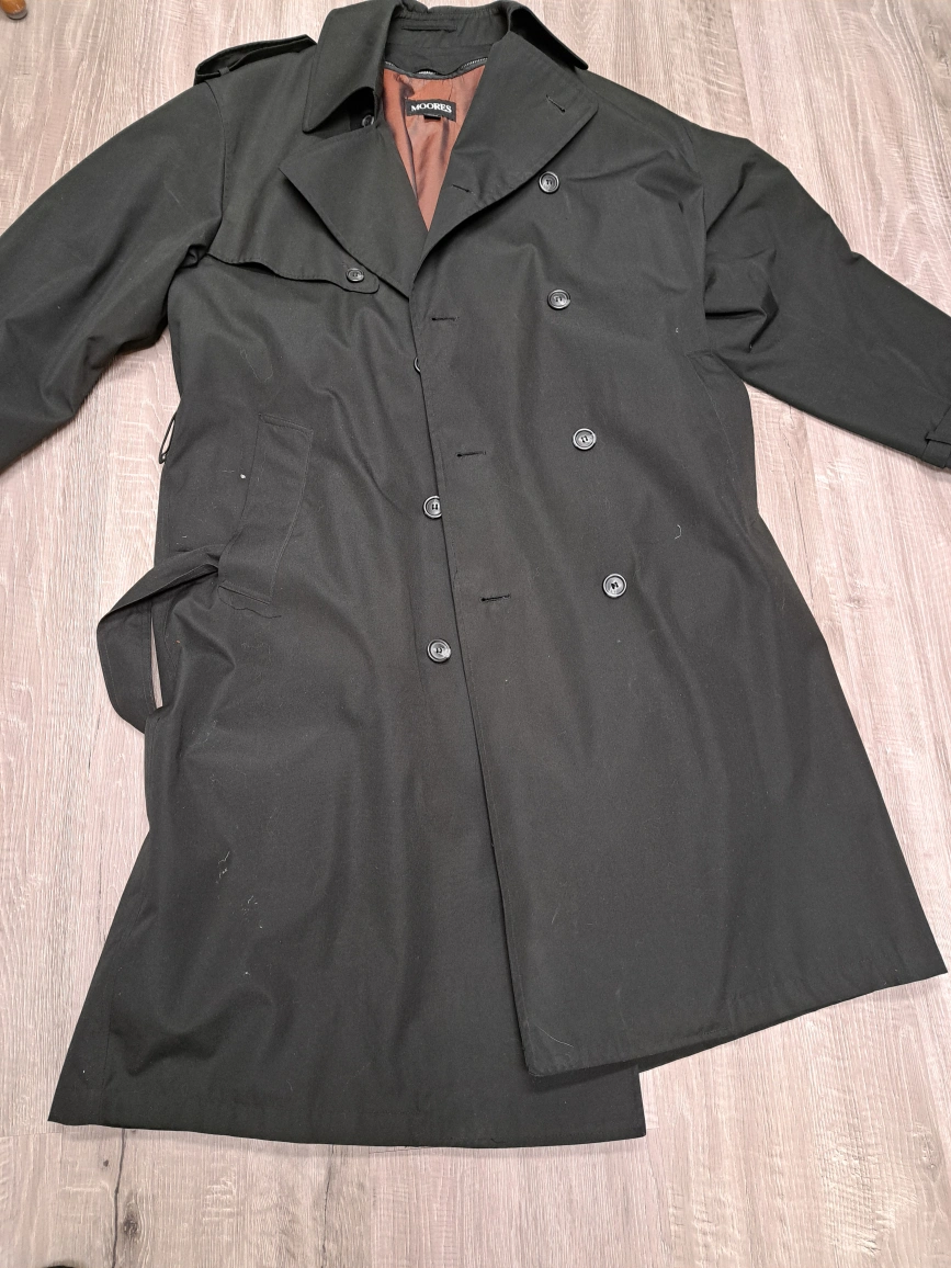 Black trench coat with belt, double breasted, fleece lined. Size 42 regular.