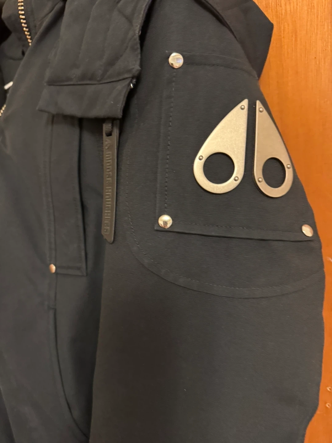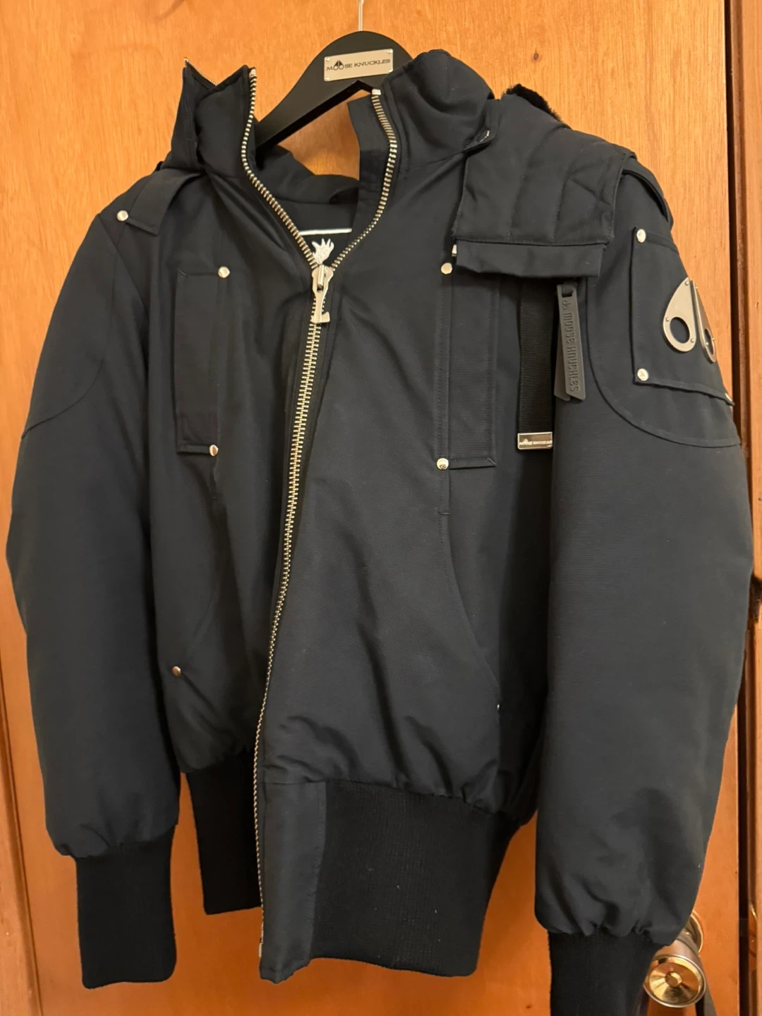 Selling a Moose Knuckles bomber jacket in size S/P. It's in great condition and ready to keep you warm this winter! The jacket features a stylish design and high-quality materials, perfect for those cold Canadian day Size small Navy blue Wear few time Very new