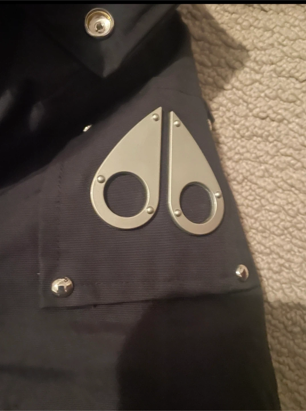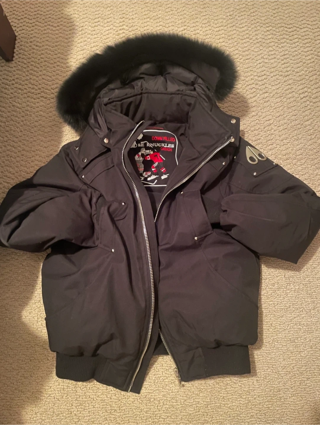 Selling a Moose Knuckles down-filled bomber jacket in black, size large! It's in great condition and ready for the cold weather. This stylish jacket will keep you warm and cozy all winter long