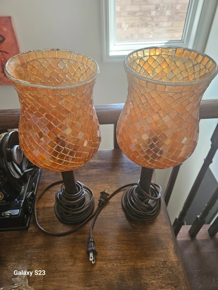 Selling a set of two mosaic glass table lamps. They add a warm and cozy glow to any room. Perfect for bedside tables or living room decor!