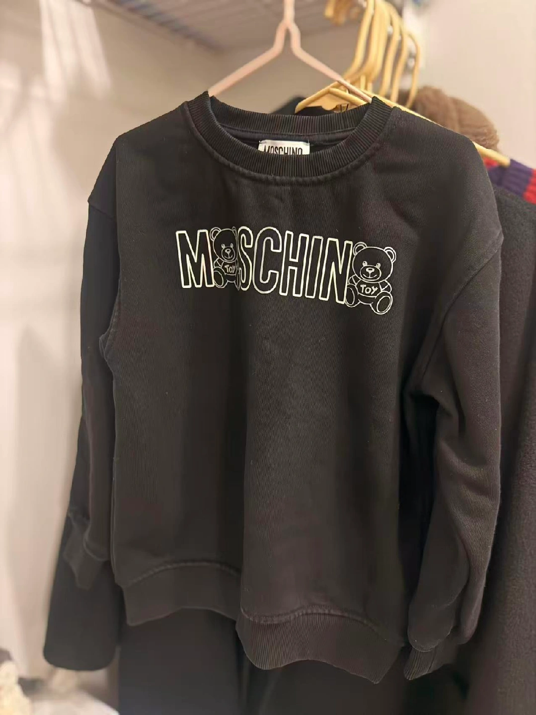 This is a cute Moschino kids sweatshirt in black. It's a size 6. The style/model is HUM03R LAA20. It's in great condition and ready for a new home!