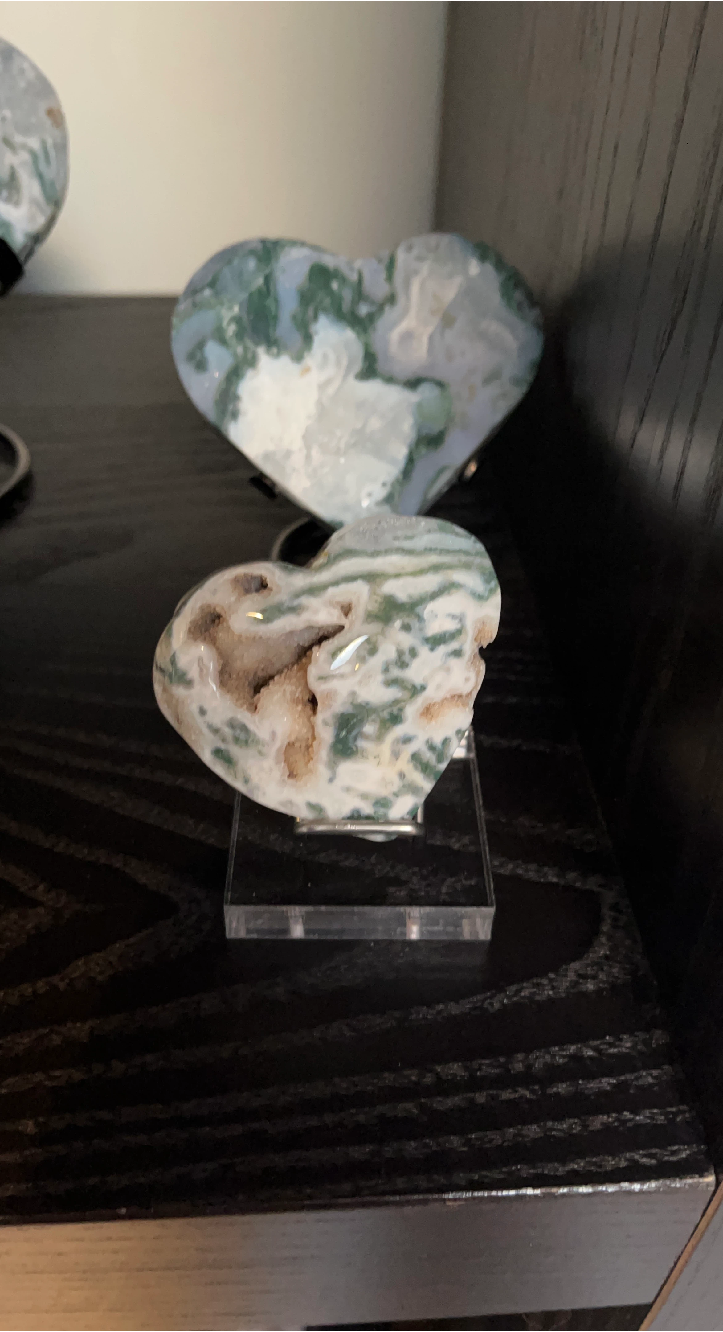 Here's a beautiful moss agate heart stone! It has lovely green and white patterns. Perfect for adding a touch of nature to your space