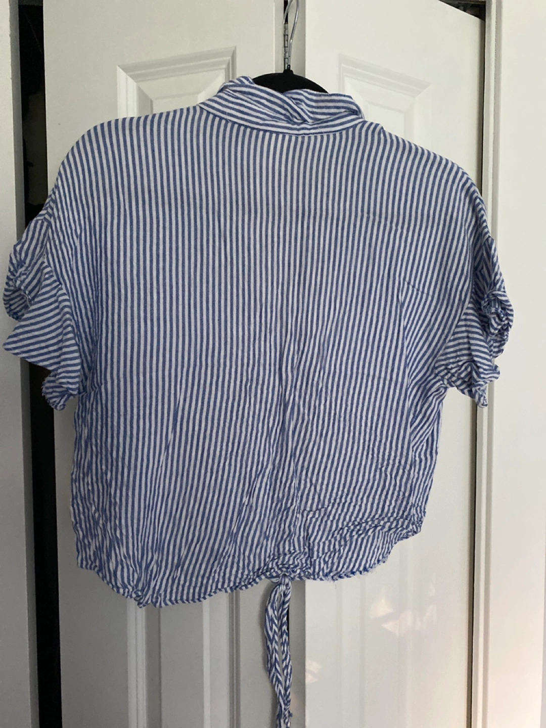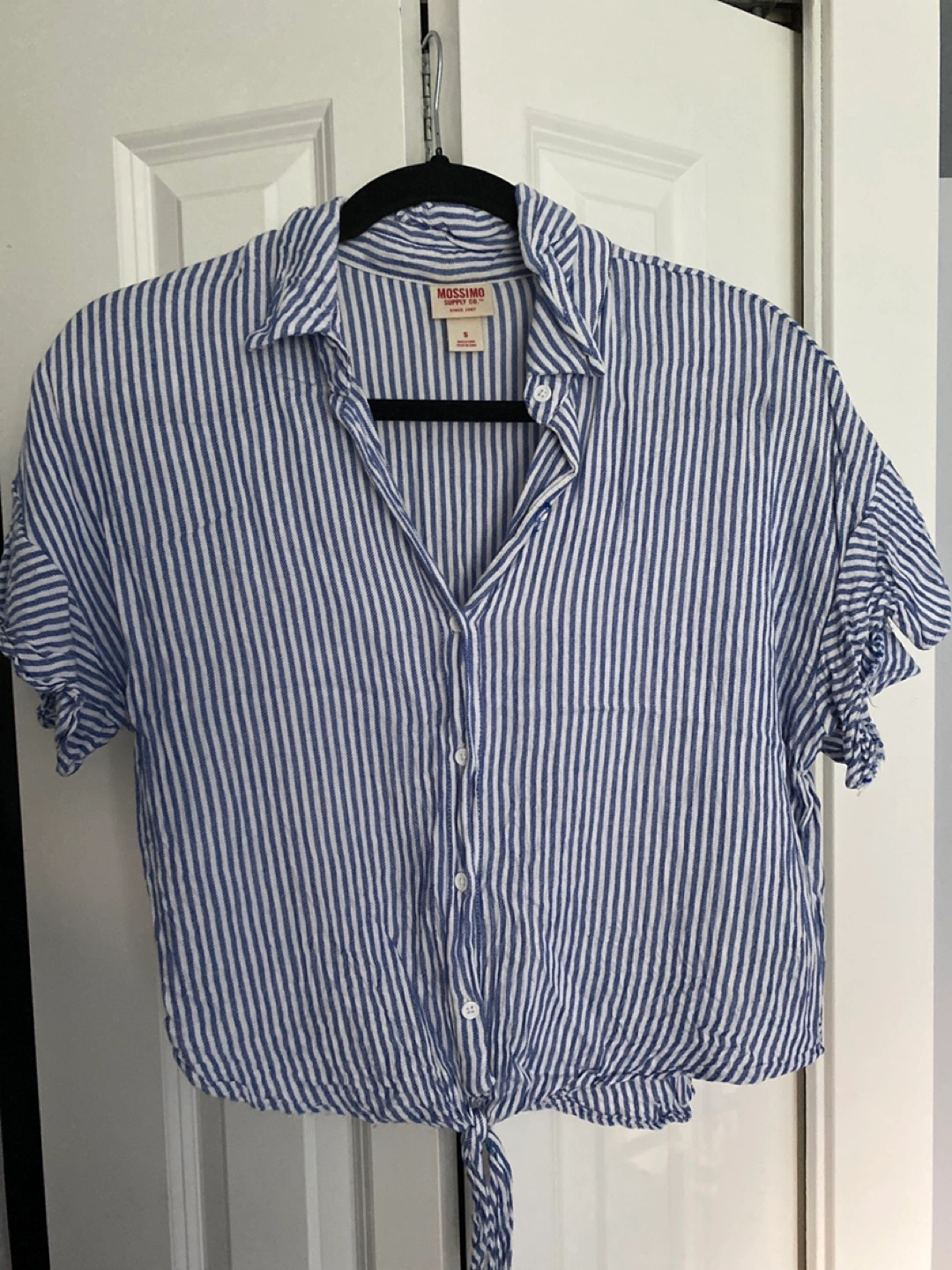 Here's a cute Mossimo Supply Co. top in size small! It features a blue and white striped pattern.
