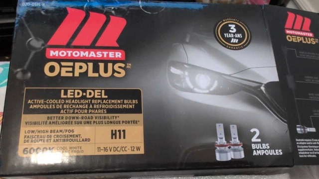 Illuminate your night drives with these MotoMaster OE Plus H11 LED headlight bulbs, offering cool white light at 6000K for enhanced visibility. These bulbs are designed for low/high beam or fog lights, operating at 11-16 V DC/CC and 12W. This is a used item. * Type: LED Headlight Bulbs * Bulb Size: H11 * Colour Temperature: 6000K (Cool White) * Voltage: 11-16 V DC/CC * Wattage: 12W