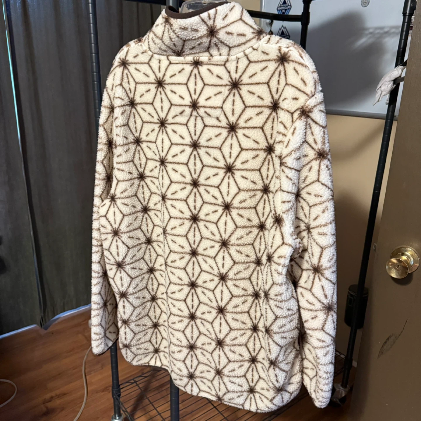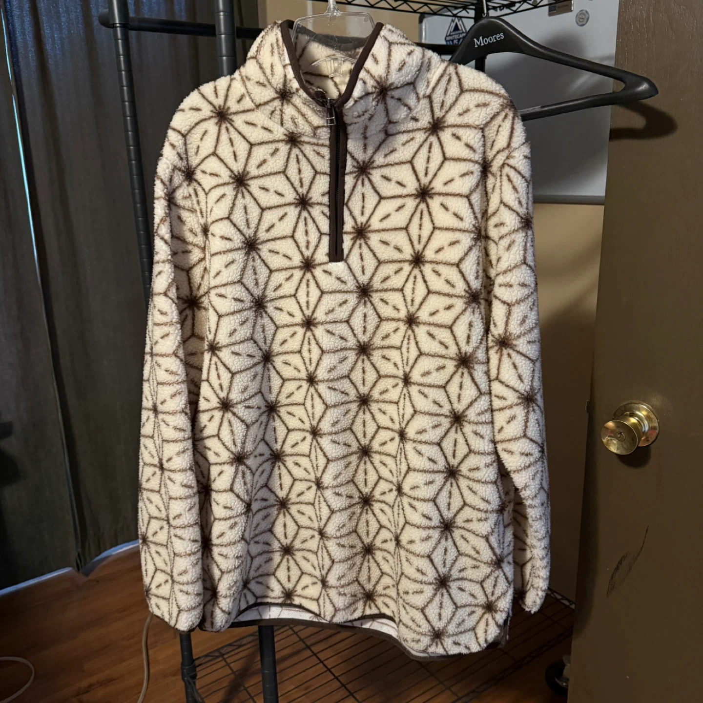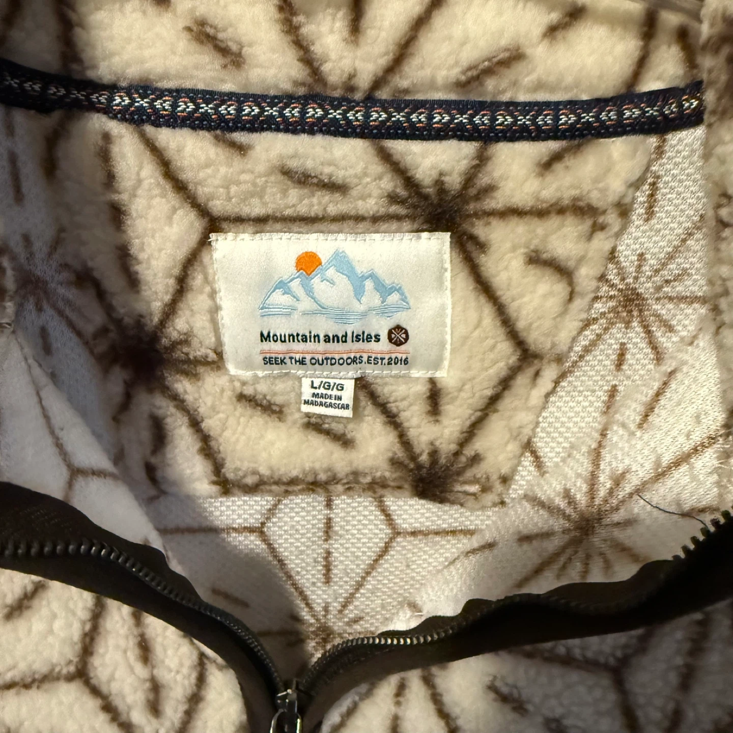 Cozy up with this Mountain and Isles fleece pullover! It's a size L/G and features a unique geometric pattern in brown and cream. Perfect for staying warm on chilly days!