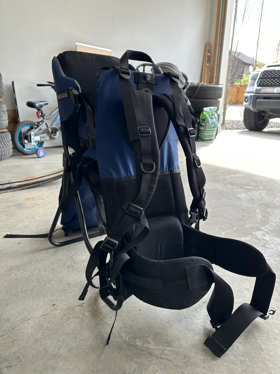 Child carrier backpack, blue colour. Includes detachable smaller backpack. Metal frame. Good used condition.