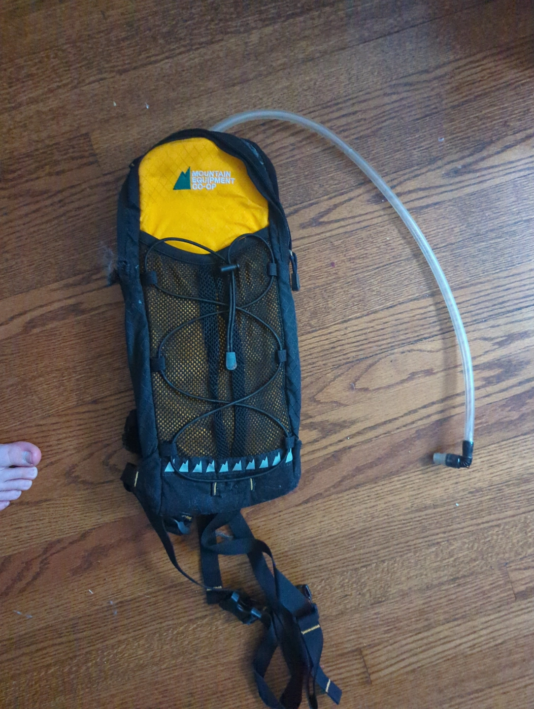 Used hydration pack. Black and yellow. Includes hydration tube. Small size.
