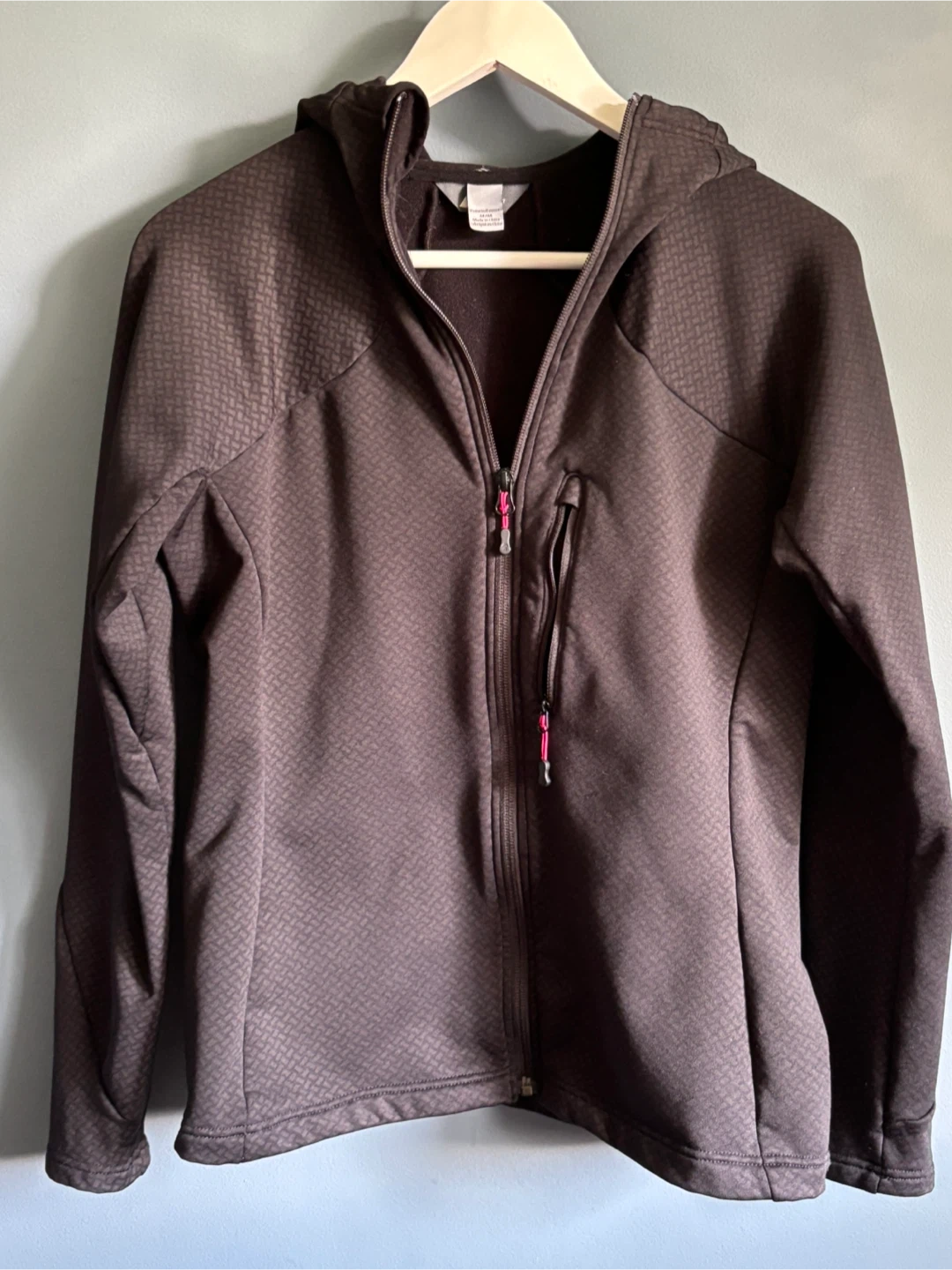 Cozy MEC fleece jacket in great condition! This Mountain Equipment Co-op jacket is a size medium and features a hood and zippered pockets. Perfect for layering on chilly days or wearing on its own for a hike