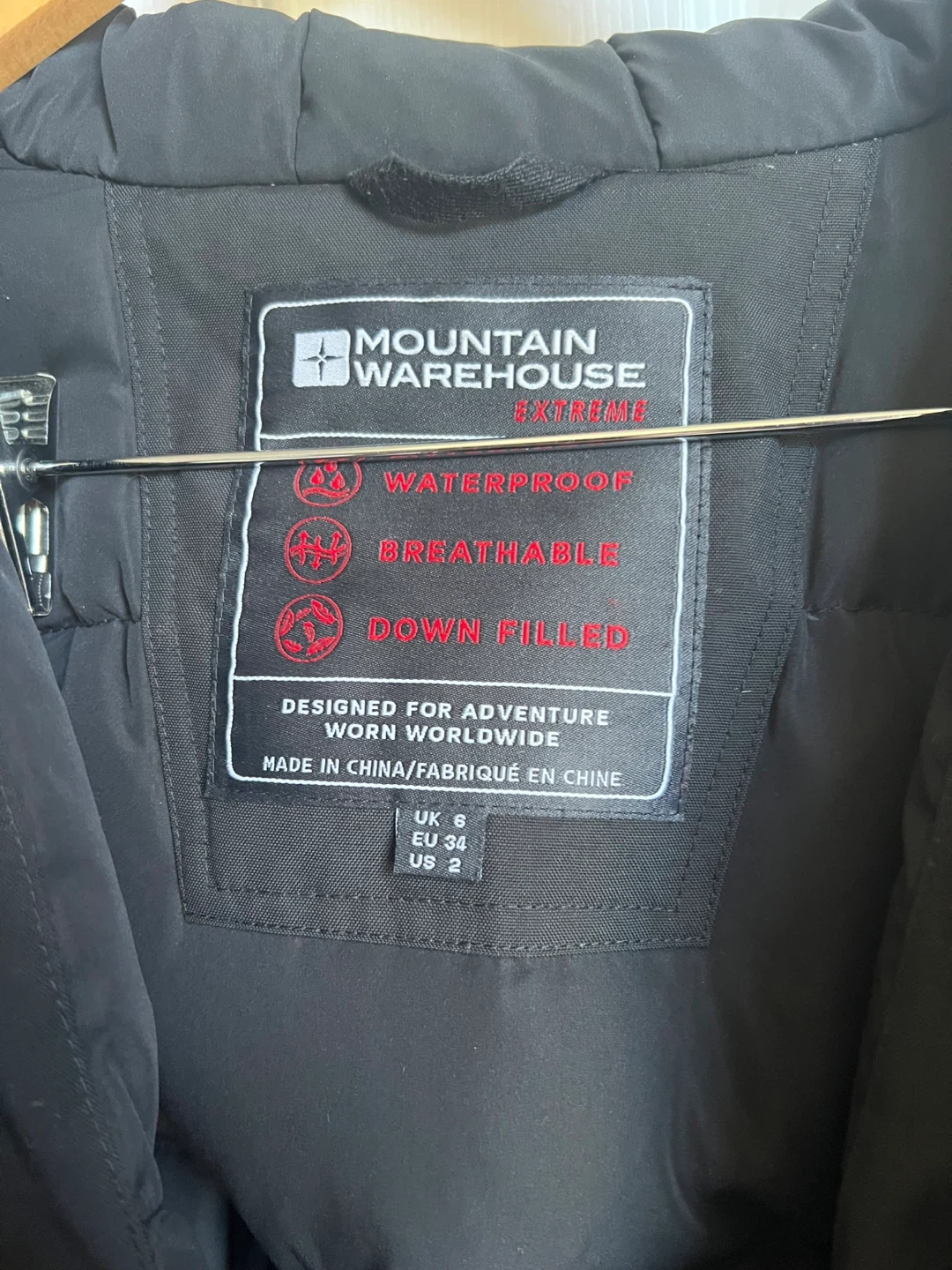 Cozy Mountain Warehouse Extreme jacket, perfect for Canadian winters! It's black, size small, and down-filled to keep you warm. It's designed for adventure and is waterproof and breathable too!