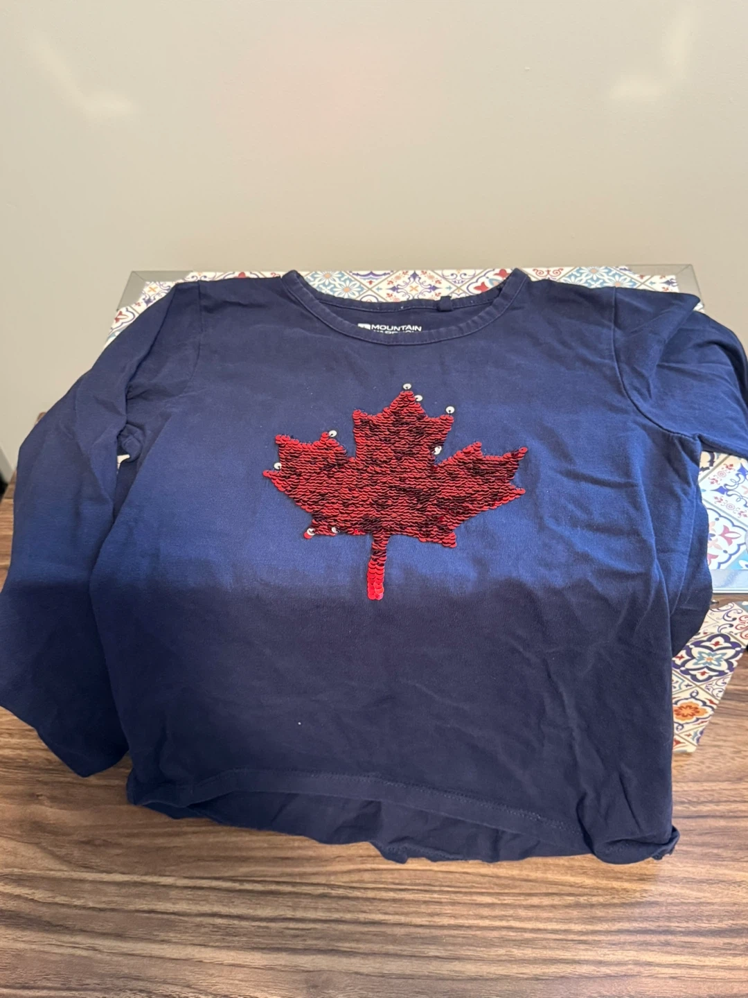 A cute long-sleeved top from Mountain Warehouse for kids, size 7-8 years! It's a navy blue colour and features a sequined maple leaf design that changes colour when you brush your hand over it.
