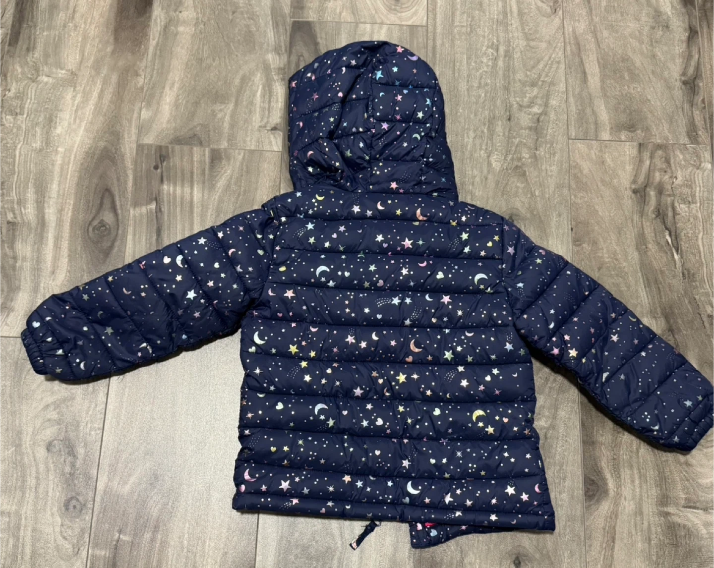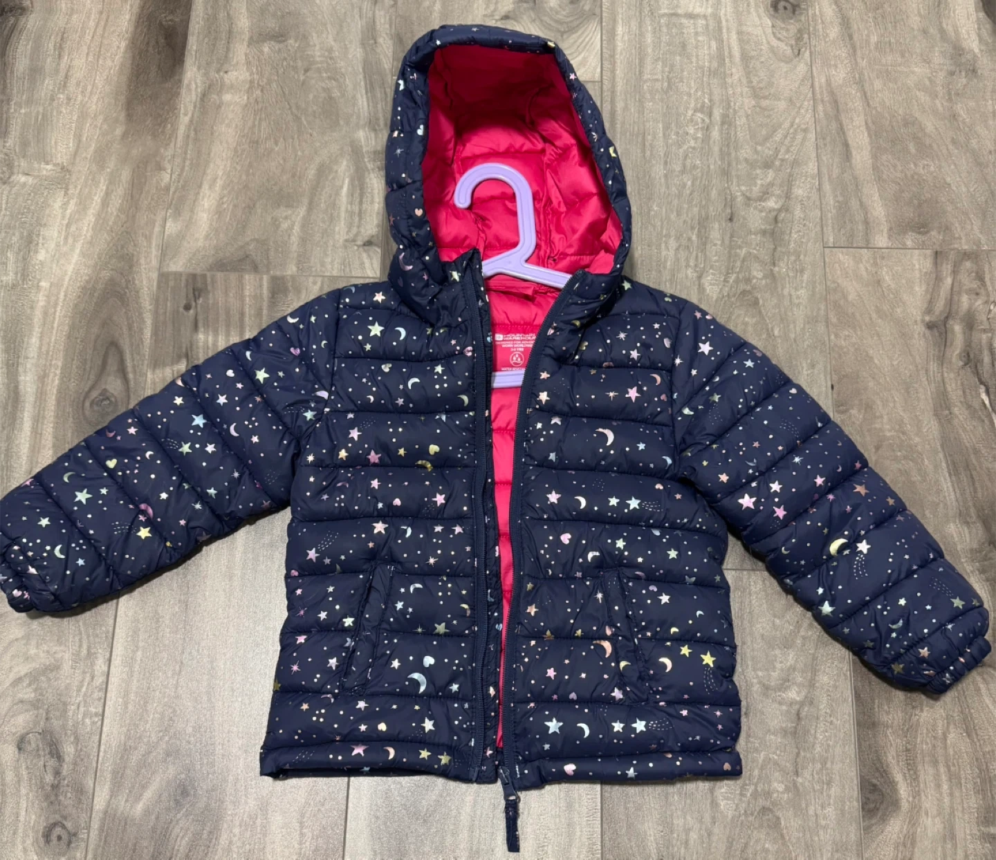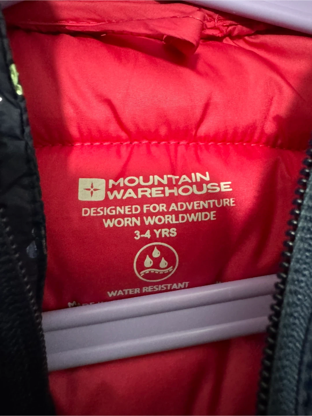 This adorable puffer jacket from Mountain Warehouse is perfect for your little one! It's designed for adventure and made to be water-resistant, so your child can stay warm and dry. The jacket is size 3-4 years and features a fun star and moon pattern on a navy blue background with a bright pink lining