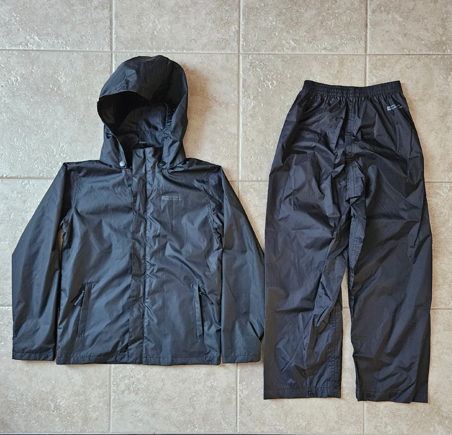 New without tags - Mountain Warehouse rain jacket and pants (Size 9-10 years). Material is very lightweight, has zippered pockets and the hood can be rolled up into the jacket's neck area. Shell and lining are 100% Polyester Milton pick up, cash only, no holds, price is as posted.