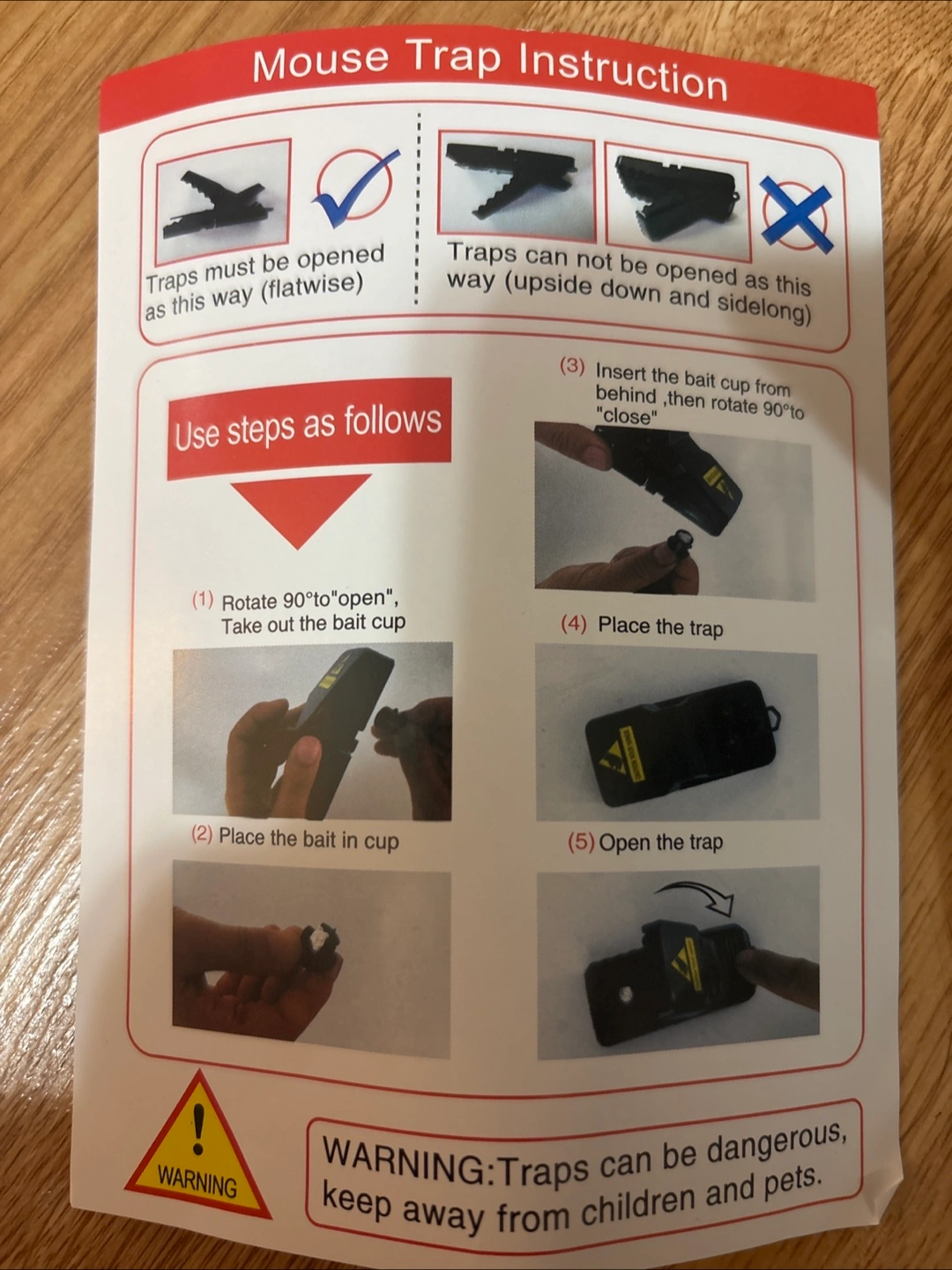 Selling a set of four new unused mouse traps. They come with instructions on how to use them. I bought a pack of 8 and only used 4. They have been pretty useful.