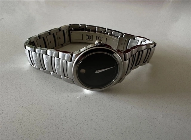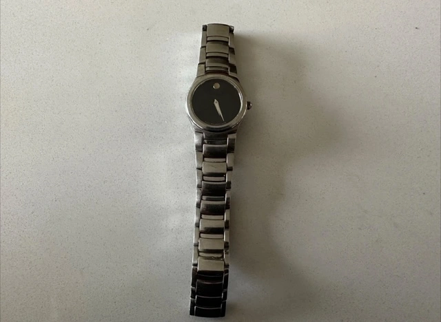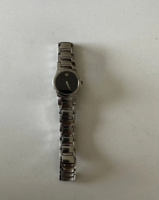 MOVADO Ladies Watch - Classic Black Dial Stainless Steel Pre-Owned - Swiss Made Timepiece Beautiful Movado women's watch featuring the iconic minimalist design Movado is famous for. Classic black dial with signature dot at 12 o'clock position, polished stainless steel case and bracelet. DETAILS: Authentic Movado Swiss quartz movement Stainless steel case and bracelet Classic black dial with silver hands Adjustable stainless steel bracelet Water resistant Timeless design that never goes out of style CONDITION: Pre-owned, good working condition. Shows normal signs of wear from use but keeps accurate time. Some minor surface scratches on bracelet (typical for stainless steel watches). Condition Good Brand Movado Pick-up SW Calgary Cash Only