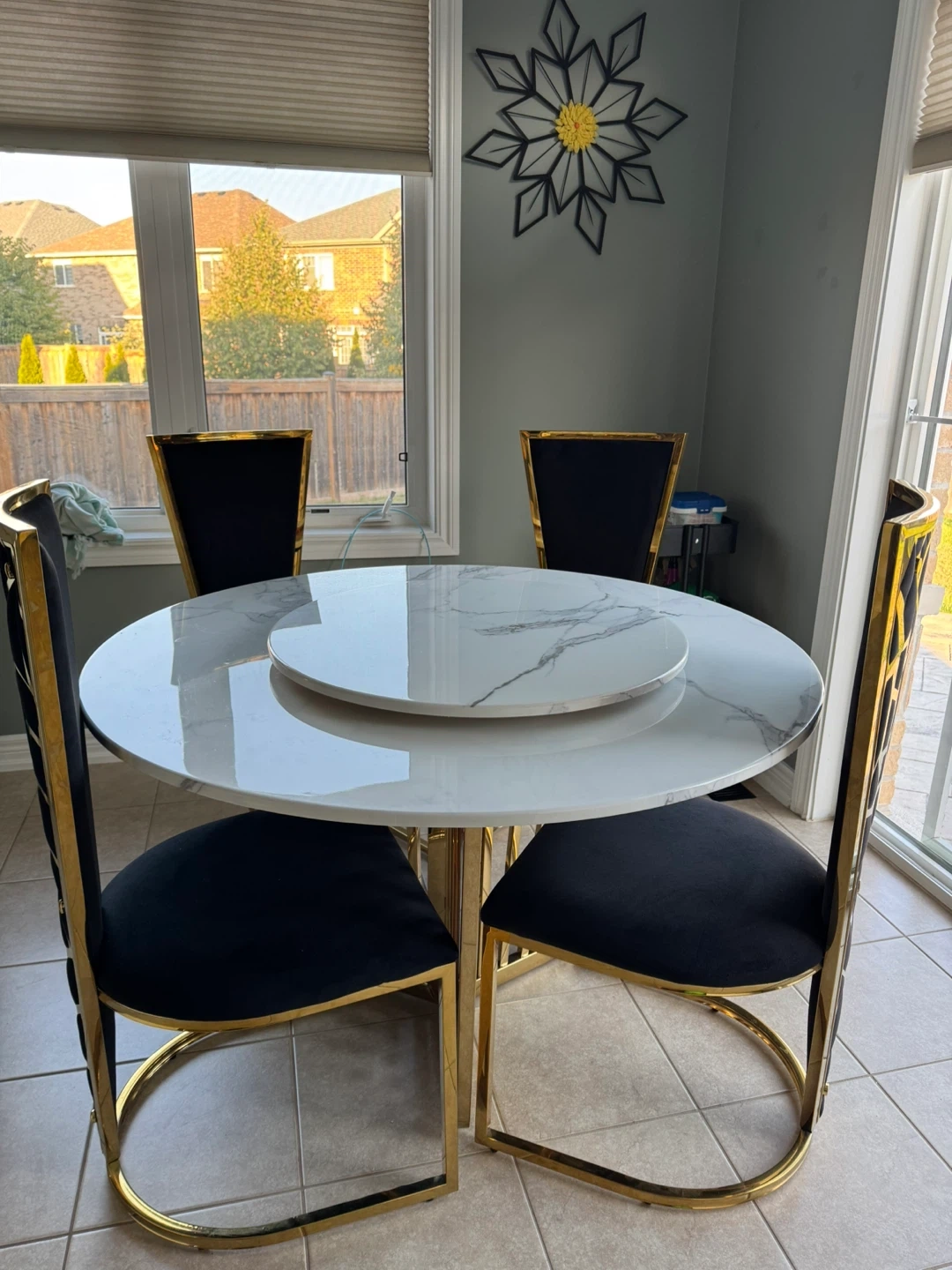 Selling a round dining table with a marble top and four chairs. The chairs feature a black velvet seat and a gold frame. It's a stylish set that would look great in any dining room! Price is negotiable