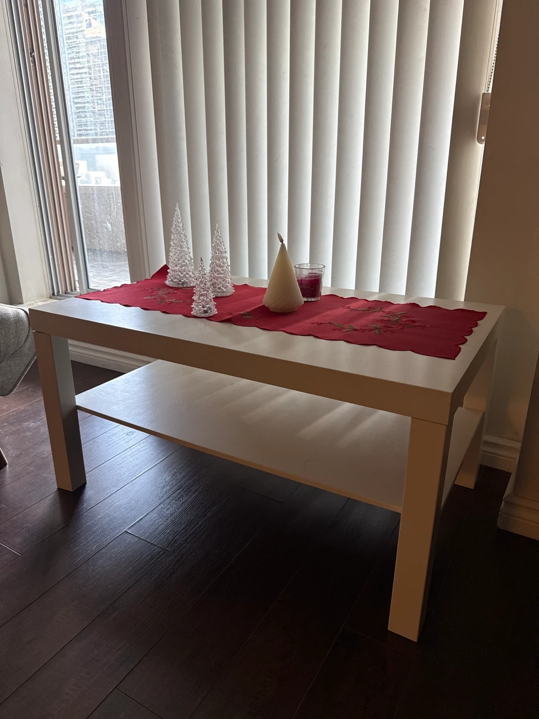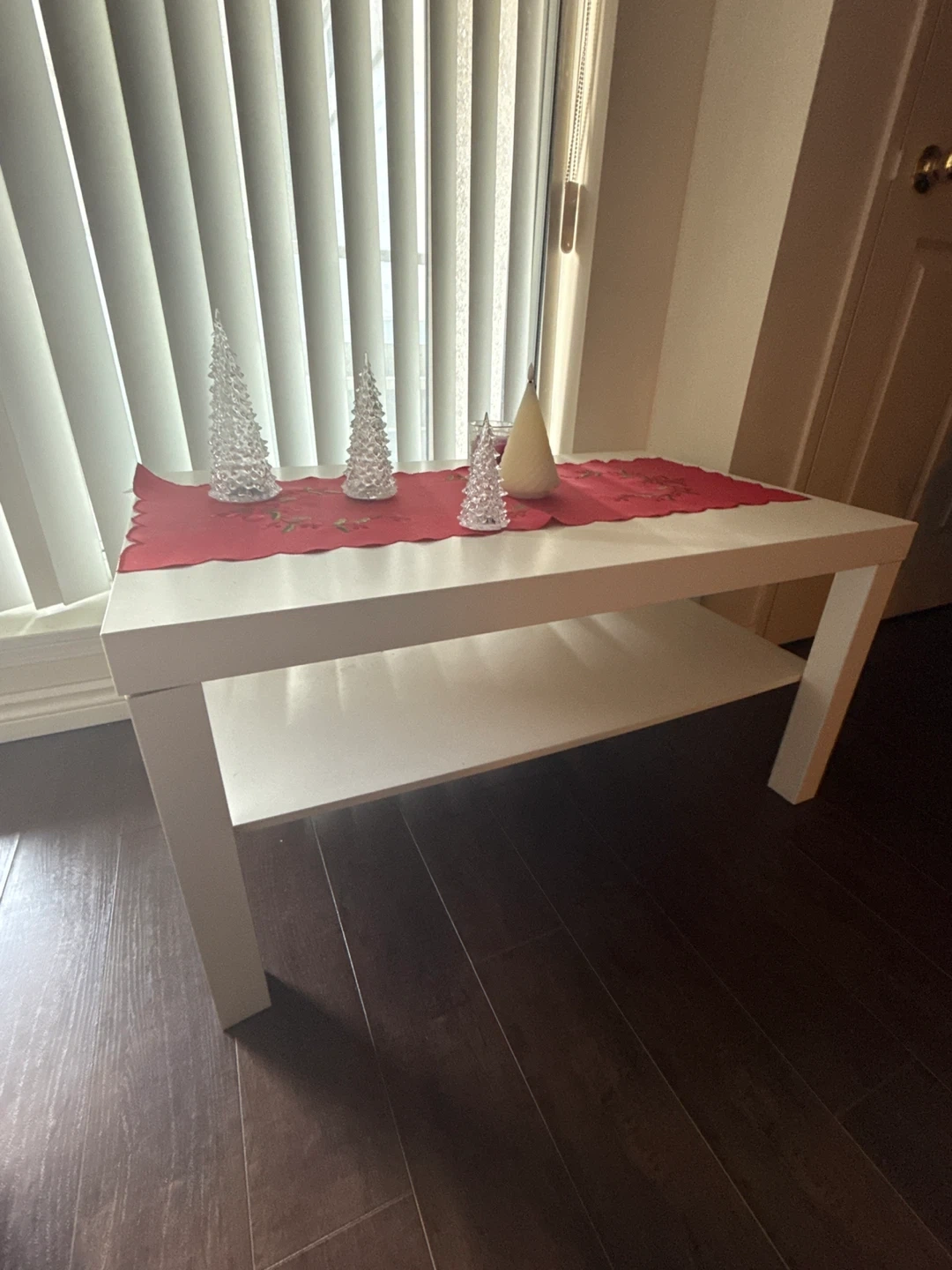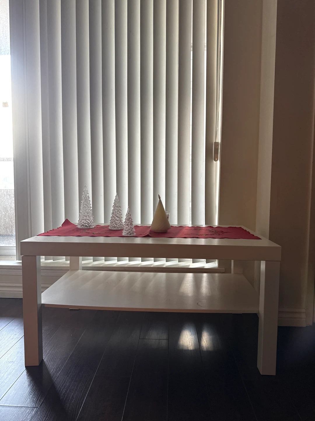 A simple and clean white coffee table, perfect for any living room. It features a convenient shelf underneath for extra storage or display. It's in great shape and ready for a new home!