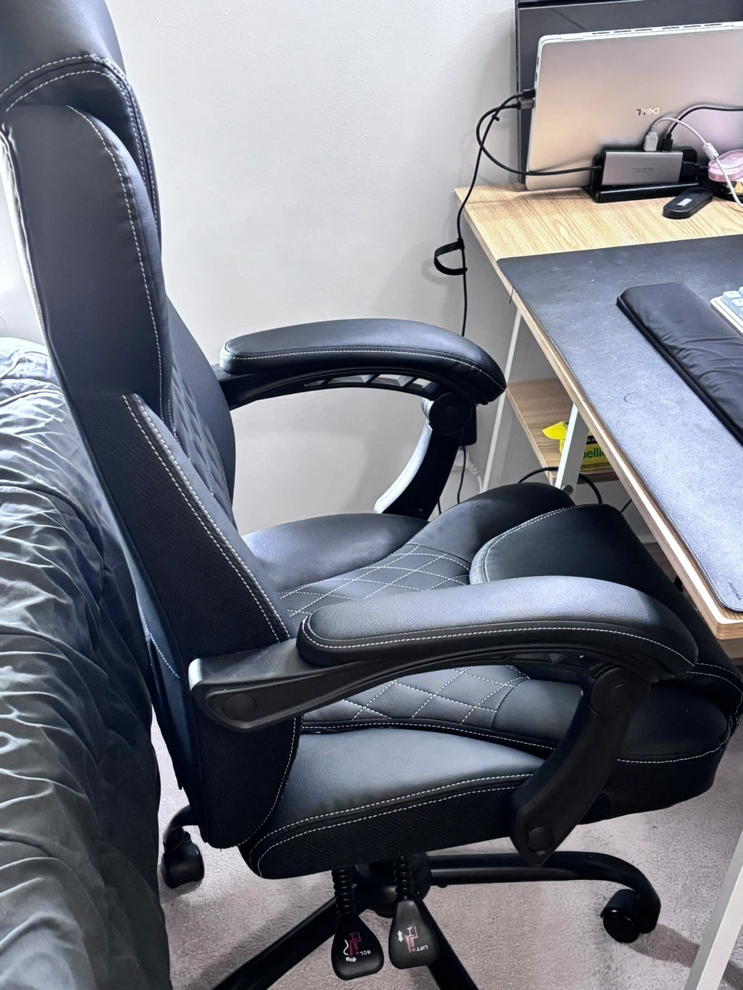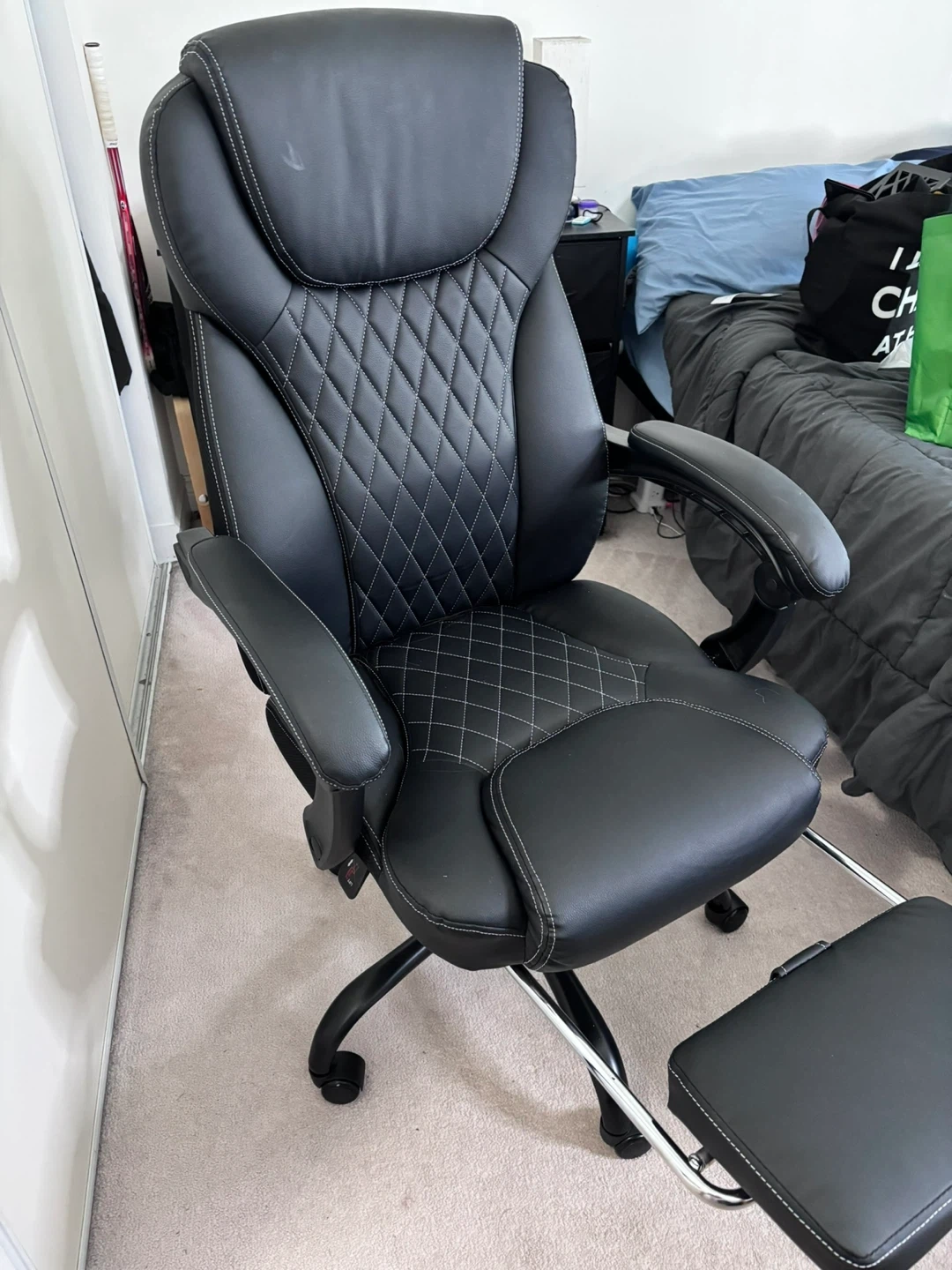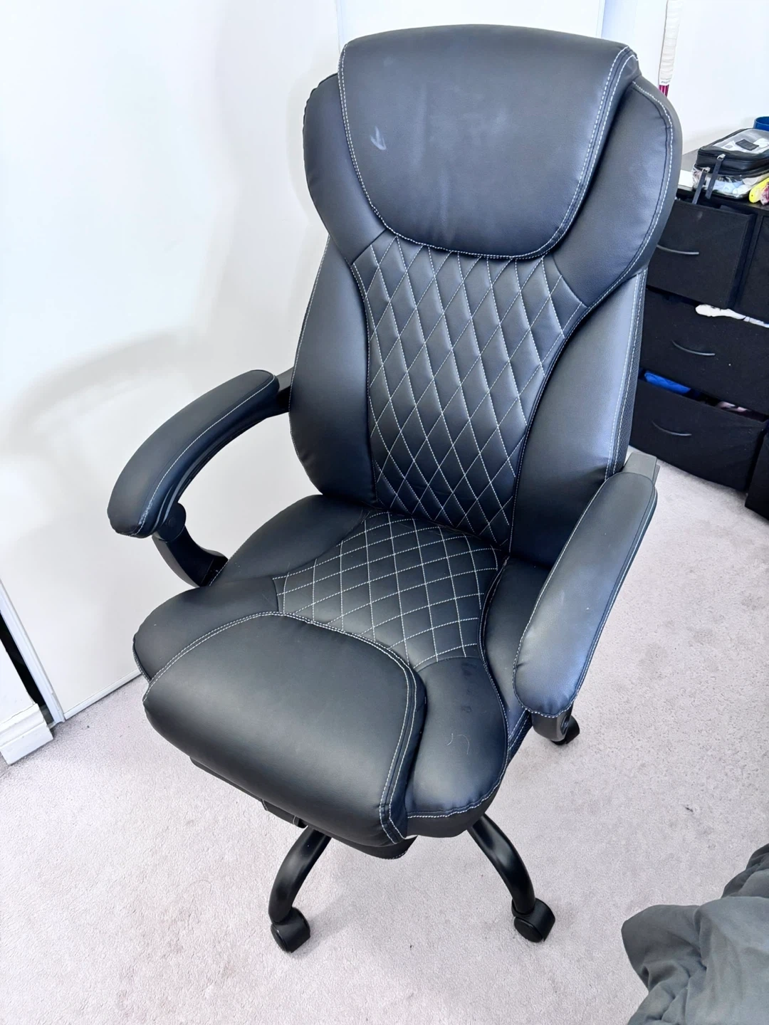 Selling a comfortable black executive office chair! It features a high back design with quilted detailing and comes with a convenient footrest. Can carry til 300lbs. Cushion is very thick too. Perfect for long hours at your desk. Used it for 3.5 months only.