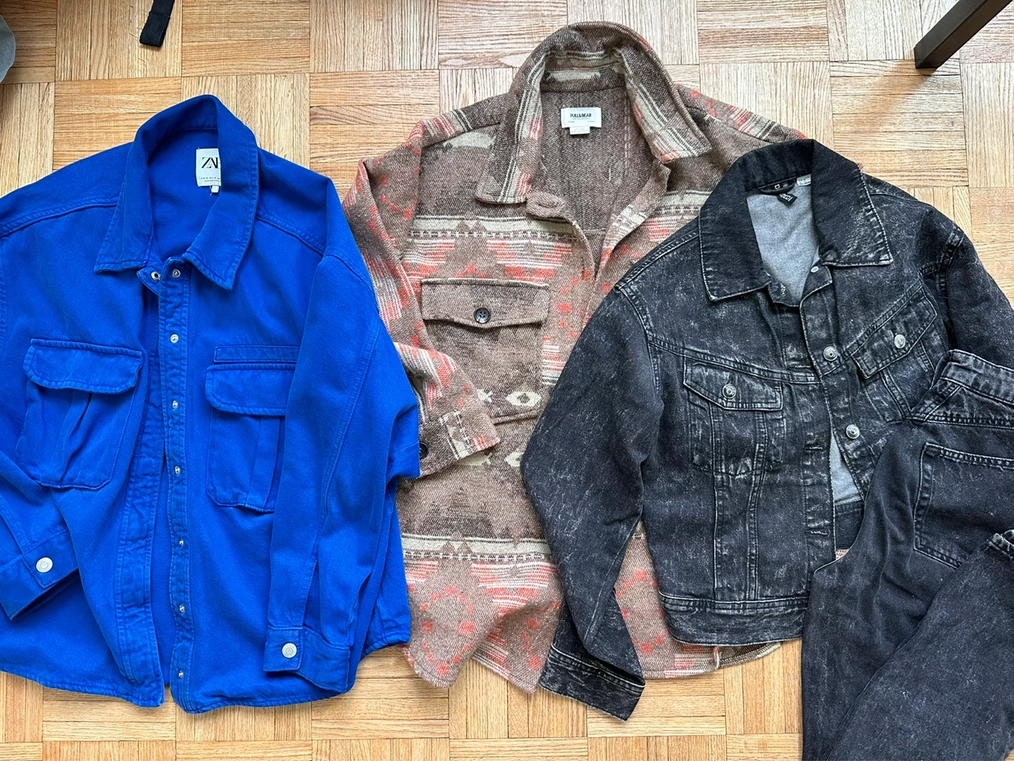 Selling a couple of jackets and a shirt! There's a bright blue denim jacket from Zara, and a patterned shirt from Pull&Bear. Also included is a black denim jacket with matching jeans from H&M. All items are in good condition and ready for a new home! Selling all together! Pick up near Yonge and Bloor