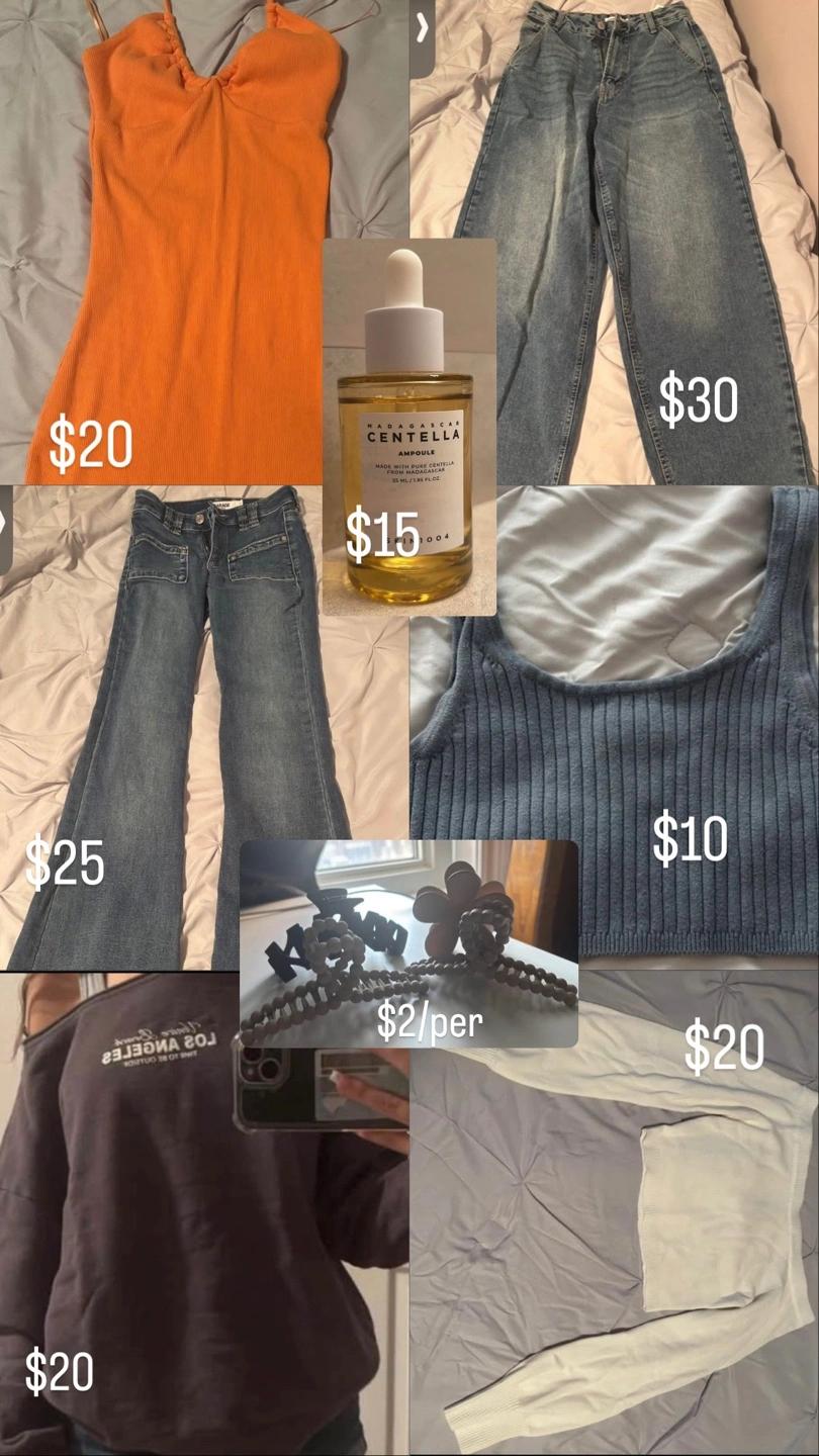 - Orange Garage dress - Urban Baggy Jeans - Garage Flared leggings - Shien Blue Crop top - Garage off the shoulder sweater - garage off the shoulder long sleeve cropped - Centella Ampoule - Shien Hair clips