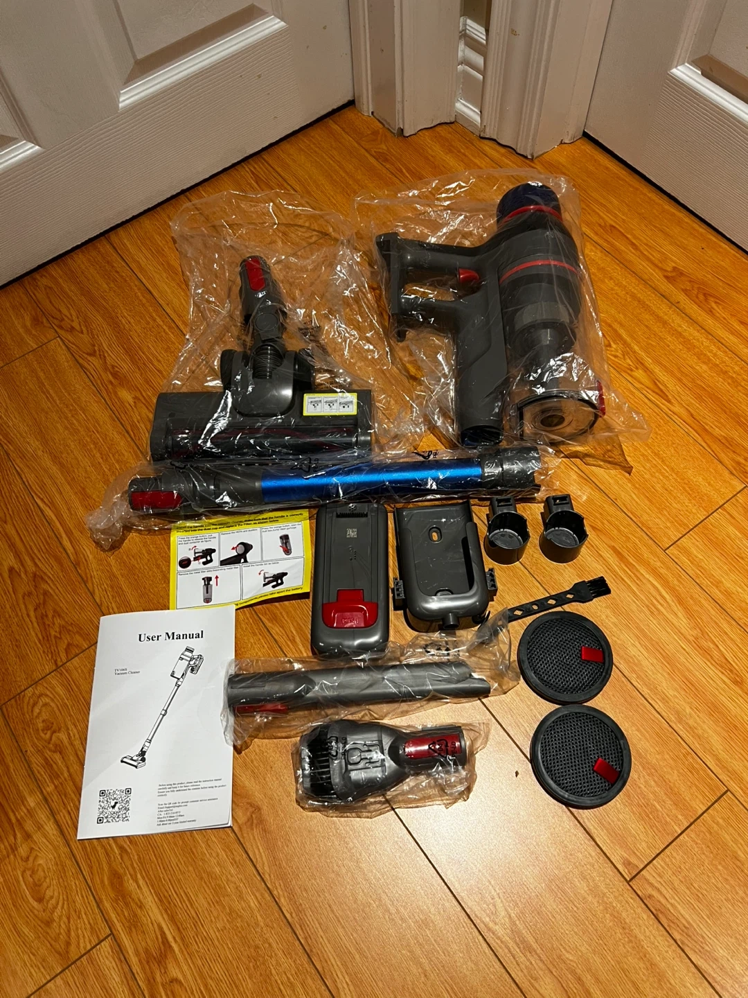 MISSING POWER CORD,COMES AS IS All components are new 【550W Ultra-Powerful Suction – Deep Carpet & Hard Floor Cleaning】Our cordless stick vacuum cleaner deep clean with true suction.Effectively removing deep-embedded dirt,pet hair,and debris from high-pile carpets,area rugs,and hard floors without loss of suction.(3-Level Suction Control: Low (Daily Cleaning) Medium (Carpets) High (Deep Cleaning, Maximum Suction). 【55-Min Long Runtime & Swappable Battery for Extended Cleaning】Uninterrupted cleaning for large homes.The removable, rechargeable battery provides up to 55 minutes of runtime,ideal for whole-house cleaning.Easily swap batteries to double your cleaning time.( This cordless vacuum cleaner delivers up to 50 minutes of runtime on low mode and 22 minutes on high mode) 【 Anti-Tangle Brush – No More Stuck Pet Hair】Self-cleaning brush roll for hassle-free pet hair removal.The upgraded anti-tangle brush prevents 99% of hair wrap,making it perfect for homes with shedding pets.This cordless stick vac is perfect for pet owners. 【 Dual HEPA Filtration – Captures 99.9% of Allergens】Breathe cleaner air. The dual HEPA filtration system traps 99.9% of allergens,dust mites,and fine particles, improving indoor air quality for allergy sufferers and pet owners. 【LED Flex Head – Precision Cleaning in Dark Corners】See & clean hidden dirt.The LED brush head illuminates dust in dark areas, making it effortless to clean under furniture,along baseboards, and tight corners.(Tip: Regularly clean the brush head to prevent tangling and ensure smooth performance.) 【 Space-Saving Design - Clean Anywhere Store Everywhere】 Equipped with a 2-in-1 brush (dusting + crevice tool), telescoping wand, and wall-mounted dock, this compact vacuum system tackles floors, car interiors, furniture gaps, and daily messes while fitting seamlessly in tight spaces. Perfect for clutter-free storage in apartments, dorms, or offices.