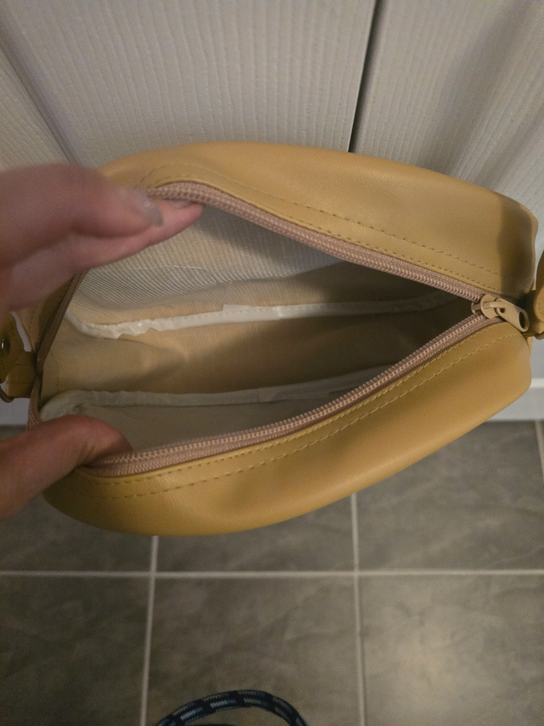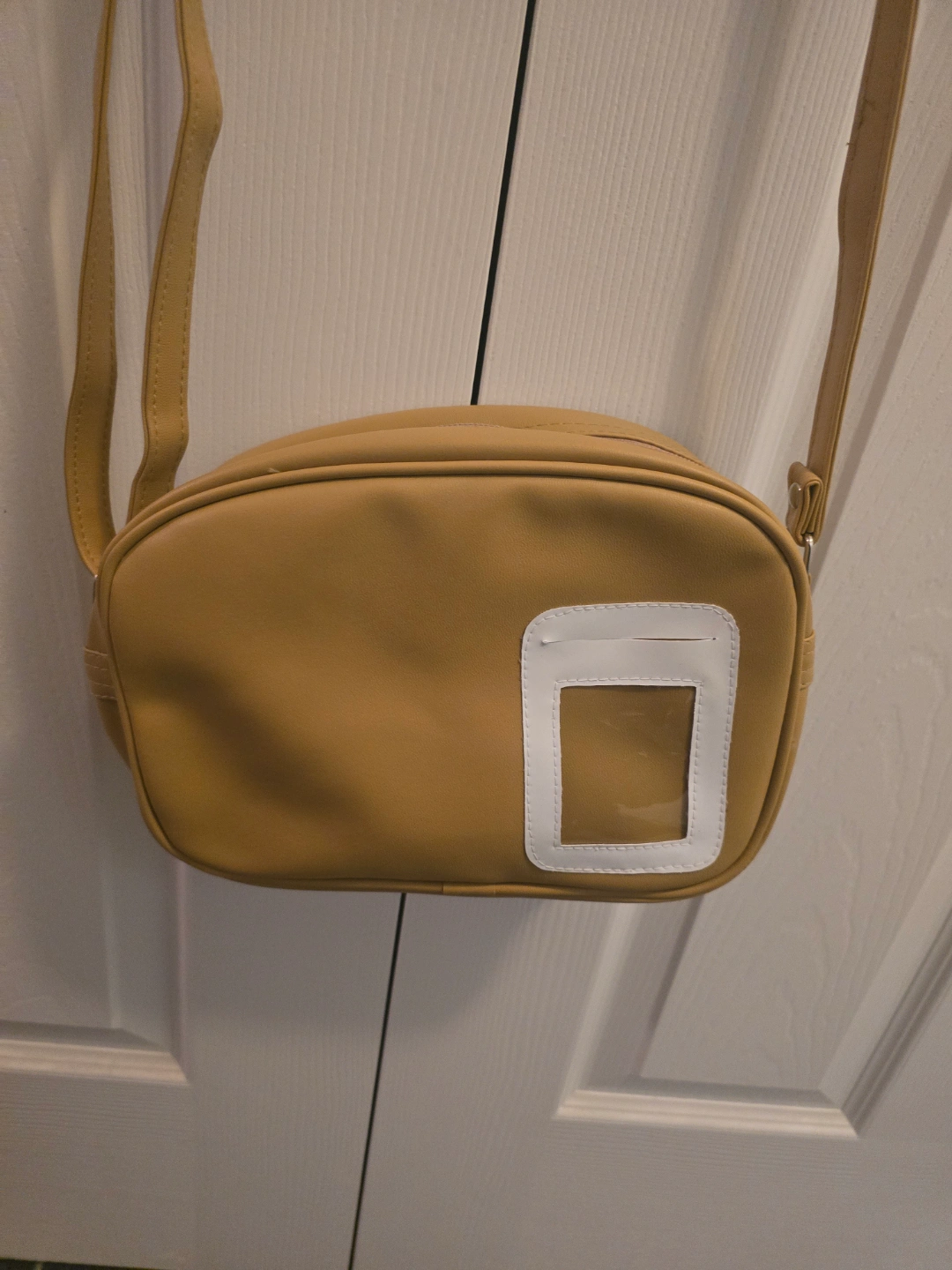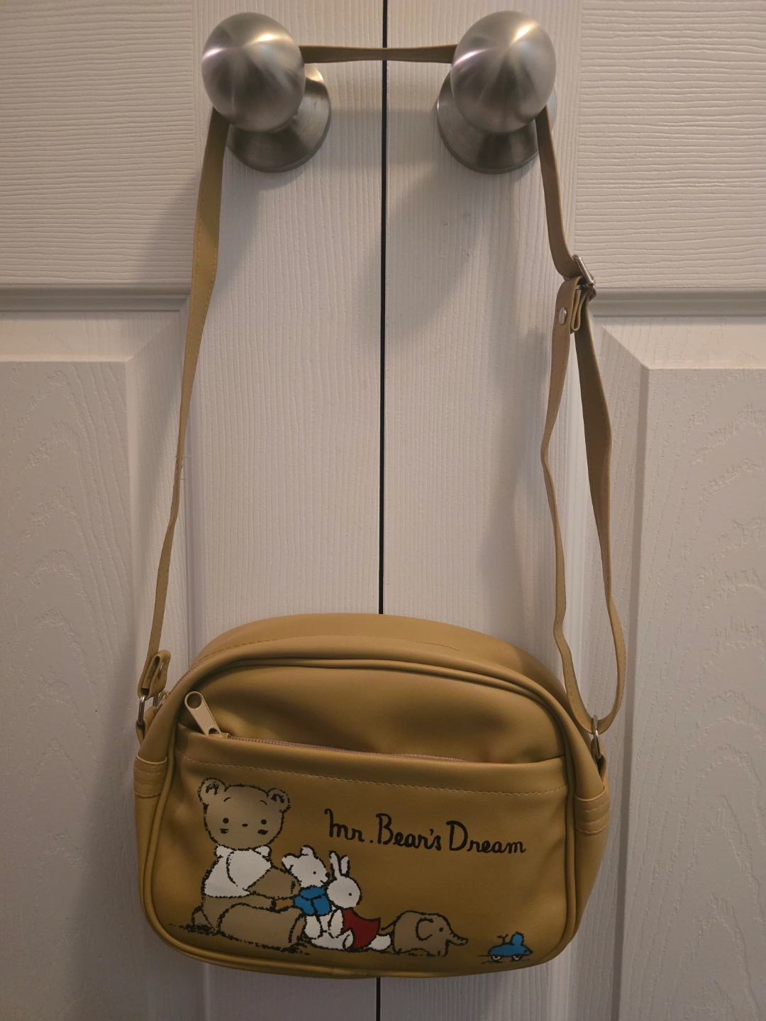 Mustard yellow crossbody bag. Features a small clear pocket and illustrated Mr. Bean's Dream design. Adjustable strap. Zipper closure.