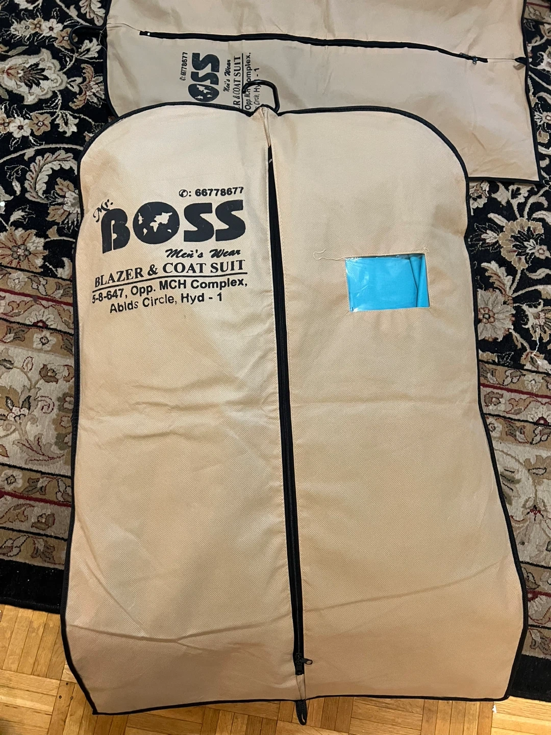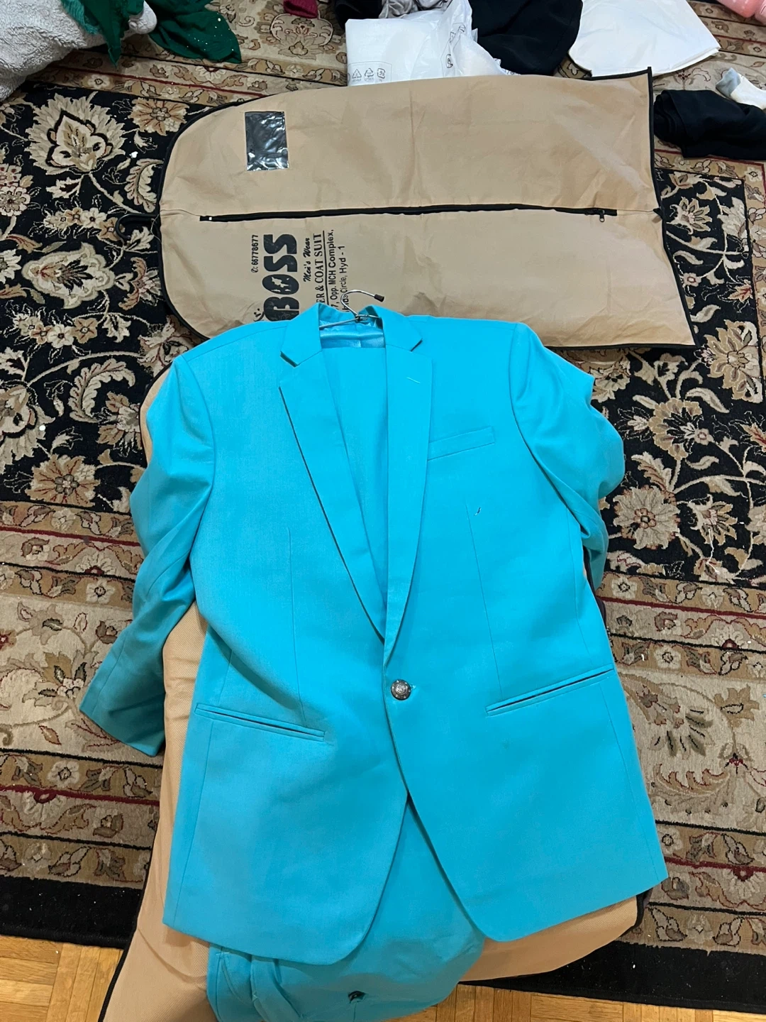 Selling a Mr. Boss blazer and coat suit in a vibrant blue colour. It comes with its original garment bag for protection and storage. Perfect for adding a pop of colour to your wardrobe!