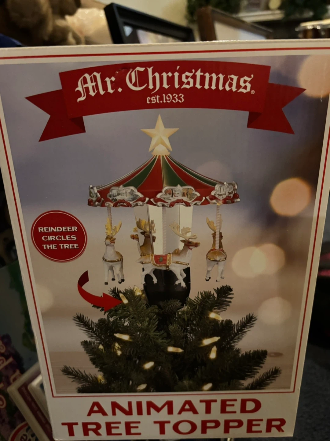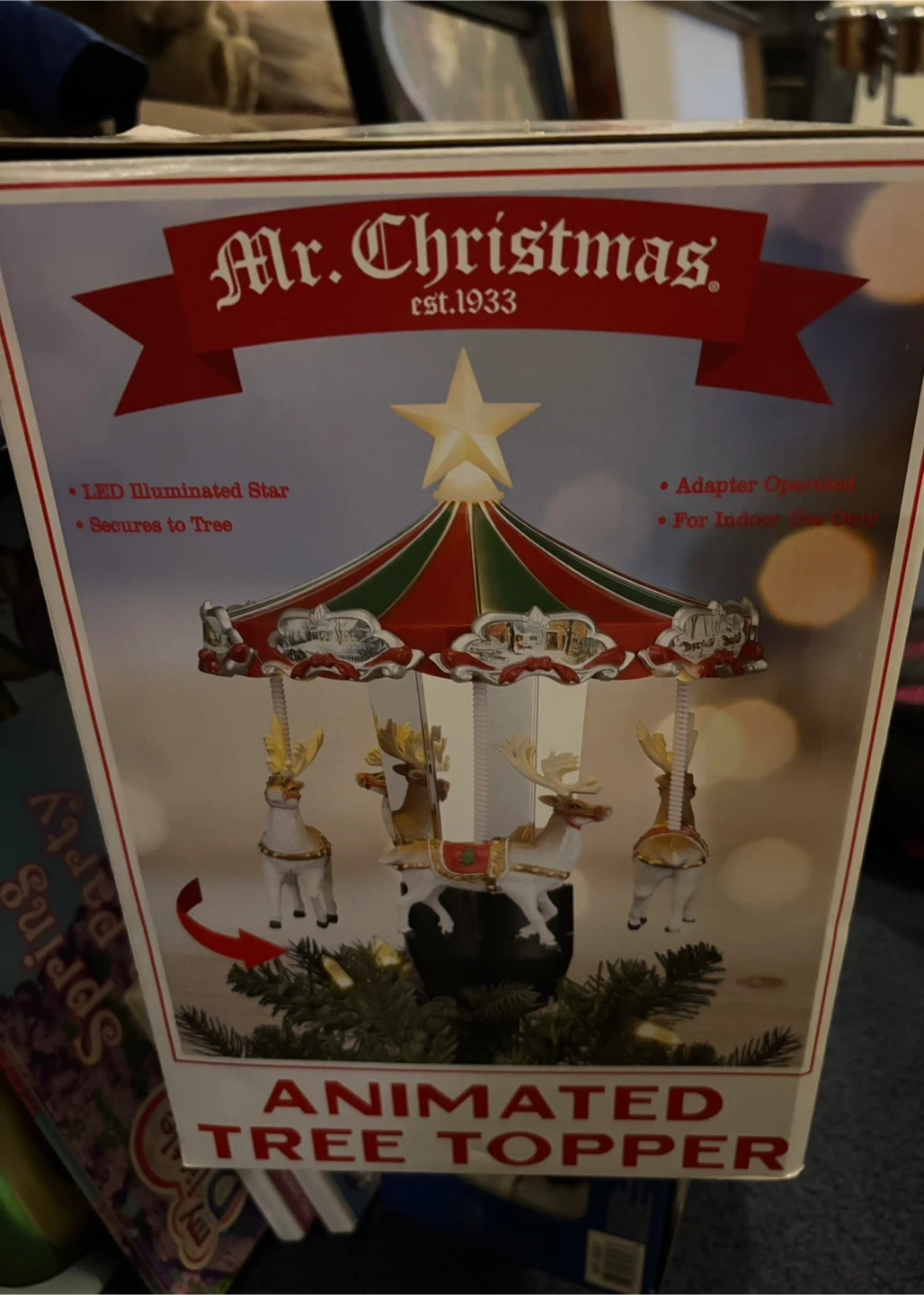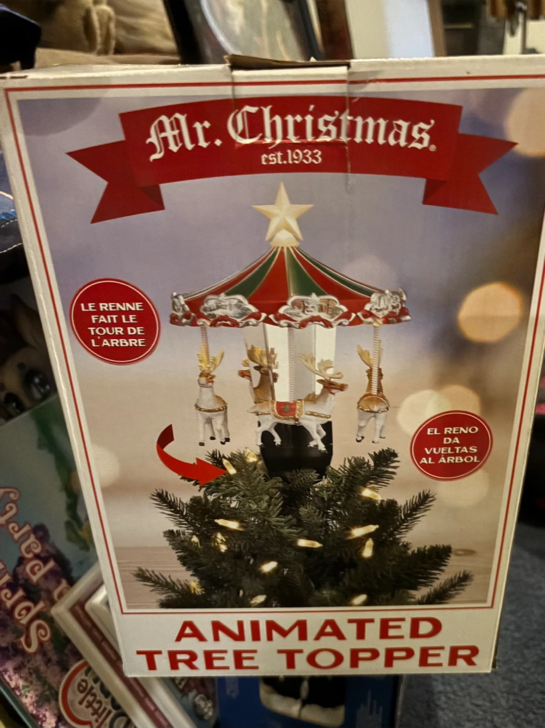 Selling a Mr. Christmas Animated Tree Topper! It's a carousel style topper that's perfect for adding some festive cheer to your Christmas tree. The box shows it has an LED illuminated star and is adapter operated. The reindeer circle the tree for a fun animated effect!