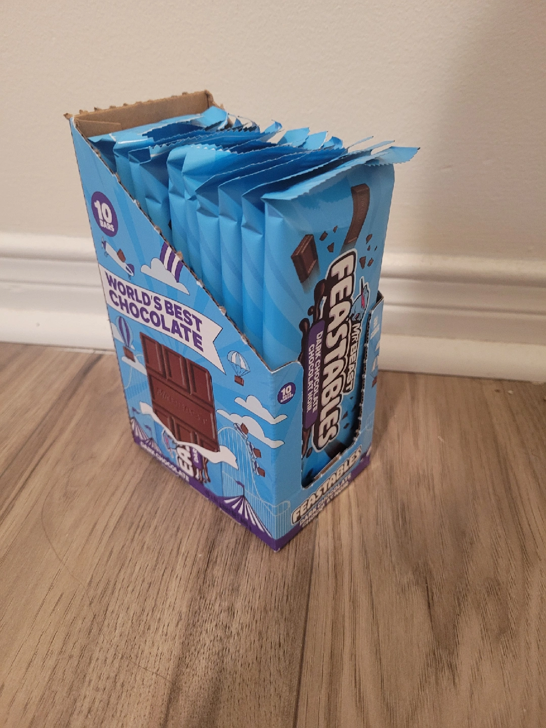 Selling 6 boxs of MrBeast Feastables Dark Chocolate Noir! The box contains 10 individually wrapped chocolate bars, perfect for sharing (or not!). Each bar is 60g of delicious dark chocolate. Enjoy!