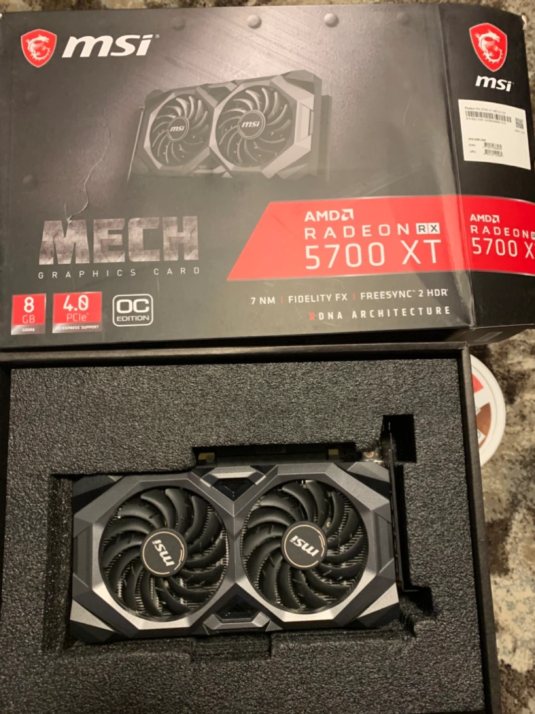 Selling an MSI AMD Radeon RX 5700 XT Mech OC graphics card. It comes with the original box. It features 7nm architecture, FidelityFX, and FreeSync 2 HDR and has been stress tested as seen in the photo