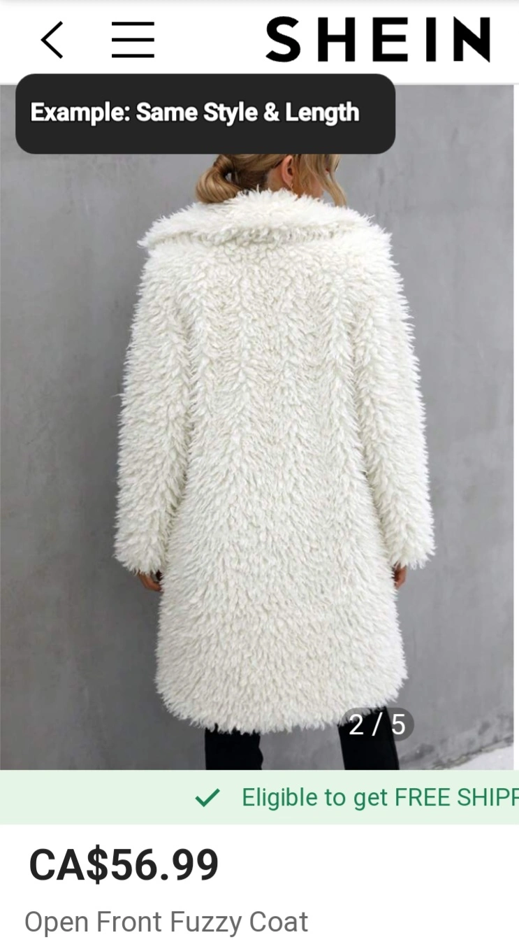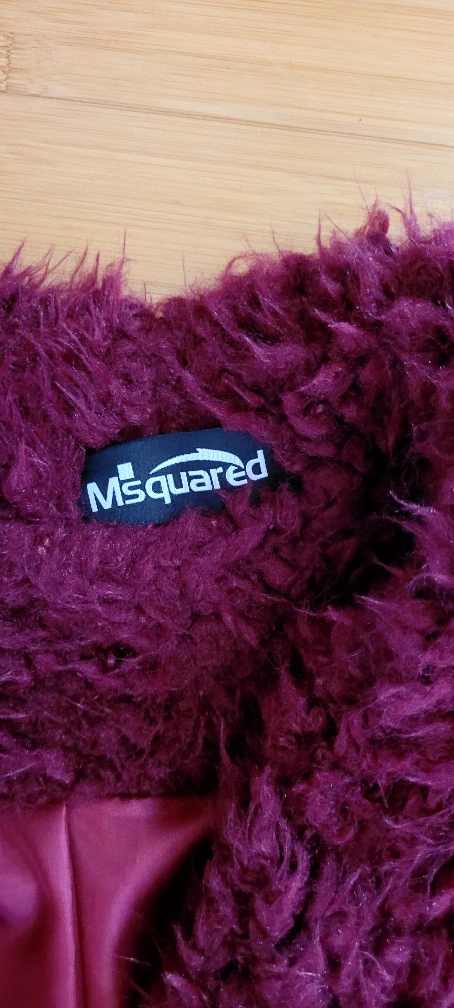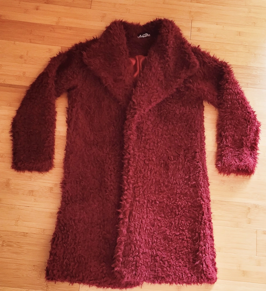 Cozy M'squared fuzzy coat in a lovely burgundy colour! It's a size large and made of 65% polyester, 30% cotton, and 5% spandex. Coat Has no buttons and is an open duster style. NOTE: White Coat is for Example only for Style and similar length.